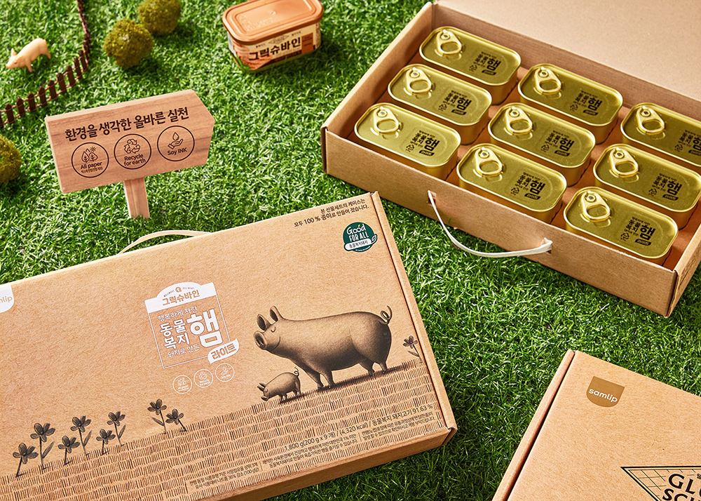 특히‘동물복지로 만든 라이트 캔햄세트 3호’에는 케이스와 손잡이 끈은 100% 재생지로 만들어진 종이 포장재를 사용했으며, 패키지에는 콩기름 잉크를 사용해 친환경 의미를 더했다.
