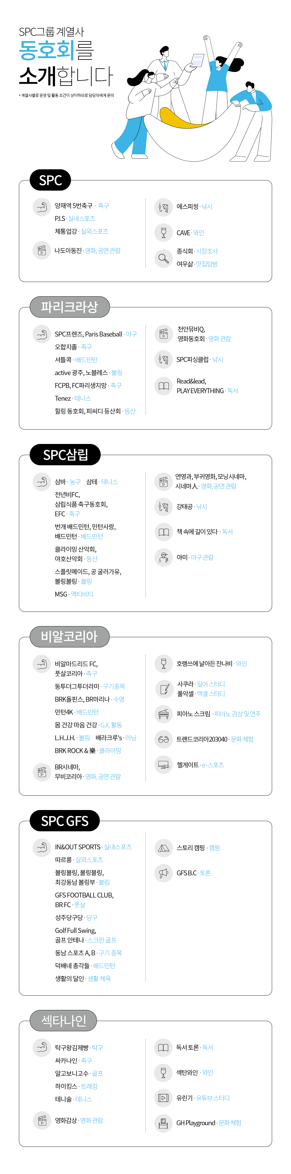 임직원들은 기존에 운영되던 동호회에 가입하거나 원하는 분야가 없으면 심사를 통해 신규 동호회 개설이 가능해졌는데요. 현재까지 활동 중인 동호회는 SPC 8개, 파리크라상 16개, SPC삼립 21개, 비알코리아 18개, SPC GFS 16개, 섹타나인 10개까지 총 89개 있습니다.