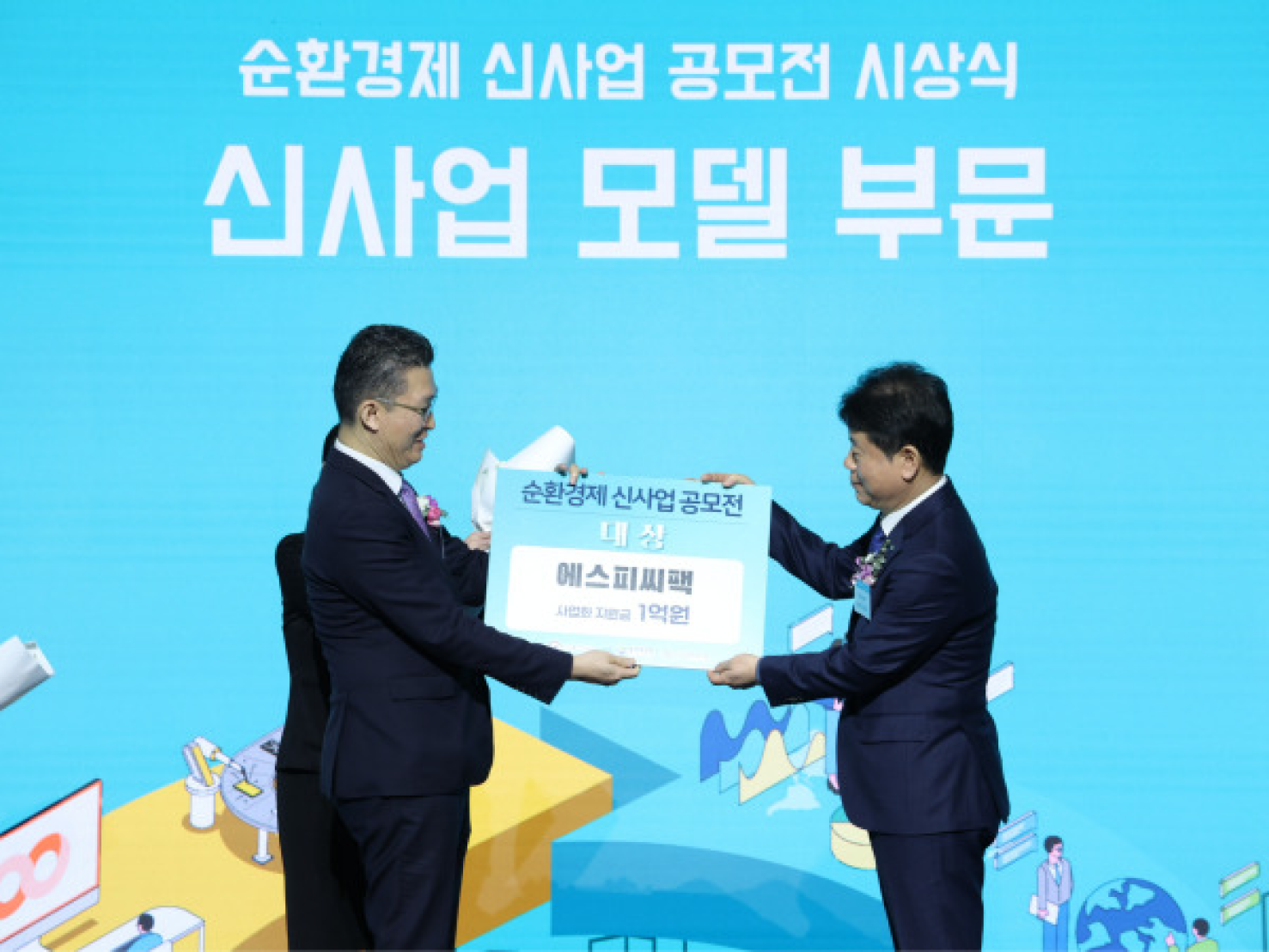 SPC팩 김창대 대표이사(오른쪽)가 '2024 순환경제 신사업 공모전' 기업 부문 대상을 수상하고 있다. 왼쪽은 산업통상자원부 산업환경과 이상은 과장.