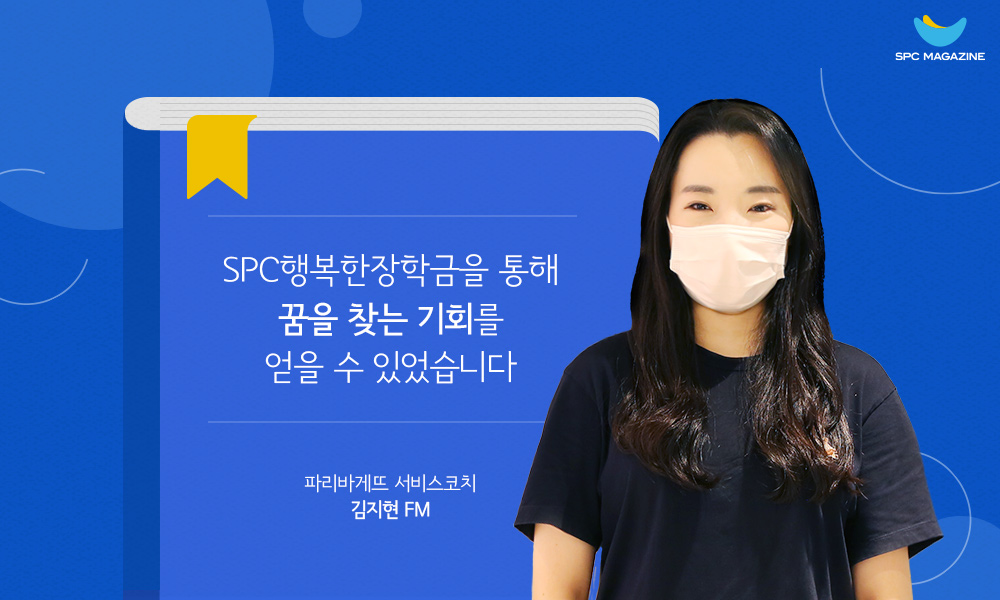 안녕하세요! 현재 파리바게뜨 2사업부 서울남부팀에서 서비스코치로 근무하고 있는 김지현 FM입니다. 수능이 끝나고 아르바이트를 찾던 도중 잠바주스 브랜드가 가진 건강함에 매료되어 잠바주스 강남본점에서 근무했는데요. 제가 성실히 근무하는 모습을 보신 점장님의 추천으로 SPC행복한장학금에 지원하게 됐고 2012년도에 받았습니다.