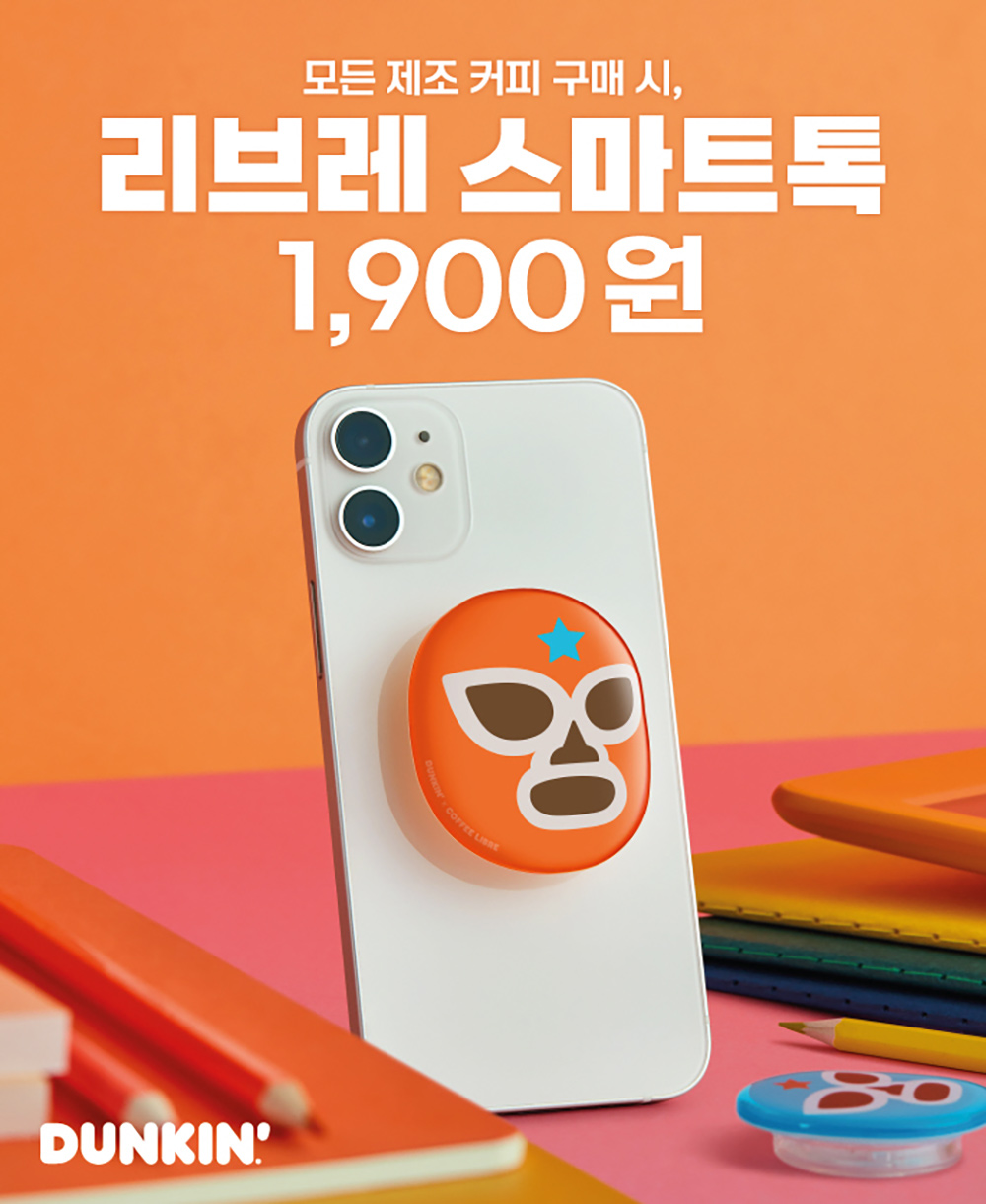 이번 신제품과 함께 출시한 ‘던킨 리브레 스마트톡’은 지난 6월 선보인 ‘리브레 아이스컵’에 이은 두 번째 리브레 협업 굿즈로, 커피 리브레의 로고에 던킨의 컬러를 입혀 만들었다.