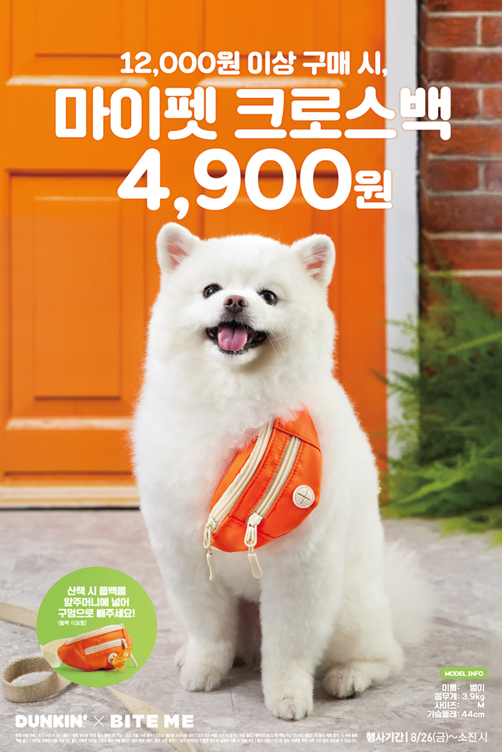 ‘마이펫 크로스백’은 반려동물이 직접 착용하는 펫 가방으로, 산책이나 외출 시 필요한 간식, 물티슈, 배변봉투 등을 수납할 수 있다. 던킨과 바잇미의 시그니처 색상인 주황색을 적용한 깔끔한 디자인으로 반려동물을 위한 패션 아이템으로 활용 가능하고, 스트랩 길이를 자유롭게 조절할 수 있어 약 4~10kg의 소형견부터 중형견까지 사이즈별 맞춤형 착용이 가능하다.