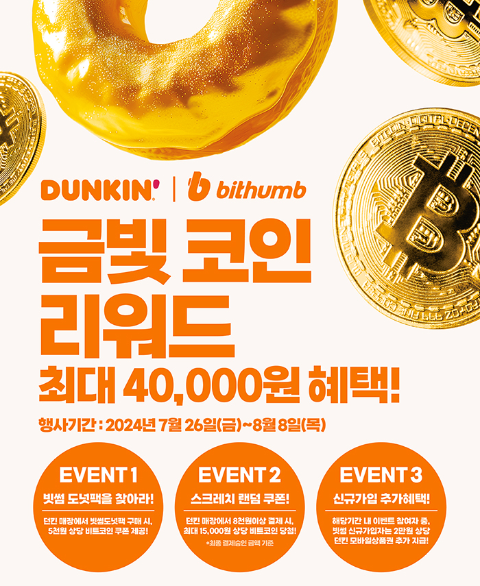 – 다음 달 8일까지 던킨 매장에서 ‘빗썸 도넛팩(3개입)’ 구매 시 5000원 상당의 비트코인 쿠폰 제공