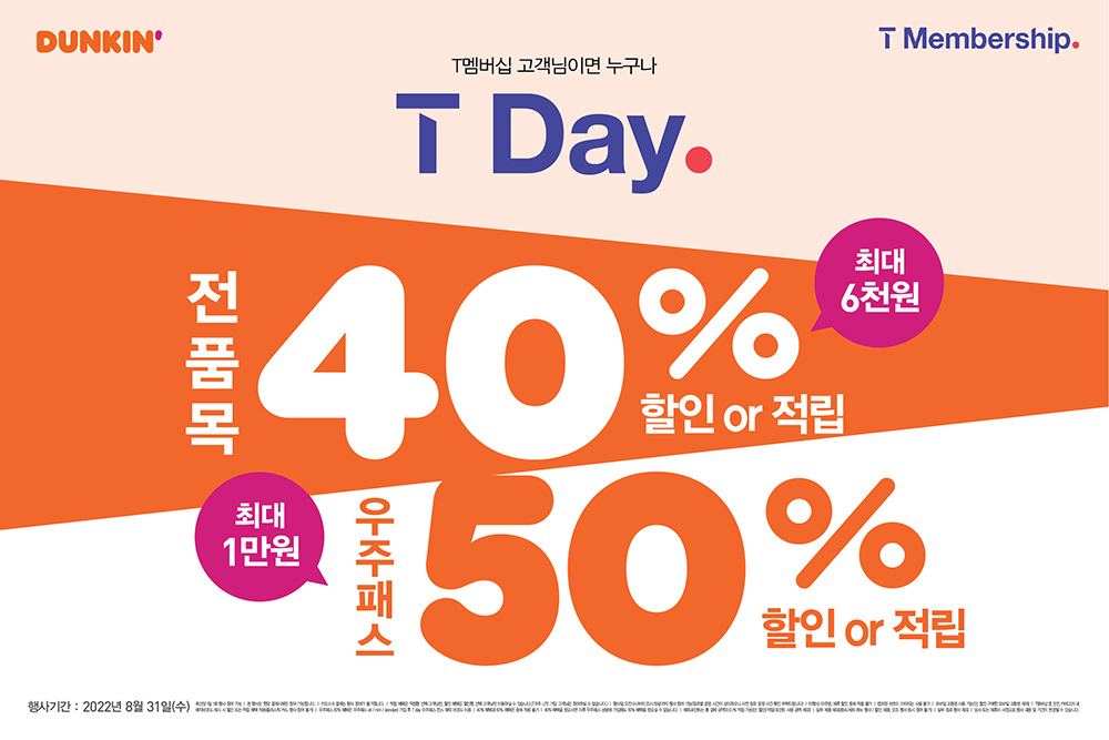 던킨은 8월 마지막 날을 특별하게 마무리할 수 있도록, 오는 31일 하루 동안 ‘SKT T-DAY 프로모션’을 진행한다. 모든 SKT 멤버십 회원을 대상으로 전 품목 40%, 우주패스에 가입한 고객에겐 50%의 할인 또는 적립 혜택을 제공한다. 최대 할인 금액은 각각 6,000원, 1만 원이다. 해당 프로모션은 1일 1회 참여 가능하며, 던킨 매장 이용 시 T 멤버십 앱에서 T 데이 매직 바코드 제시 시 혜택을 누릴 수 있다.