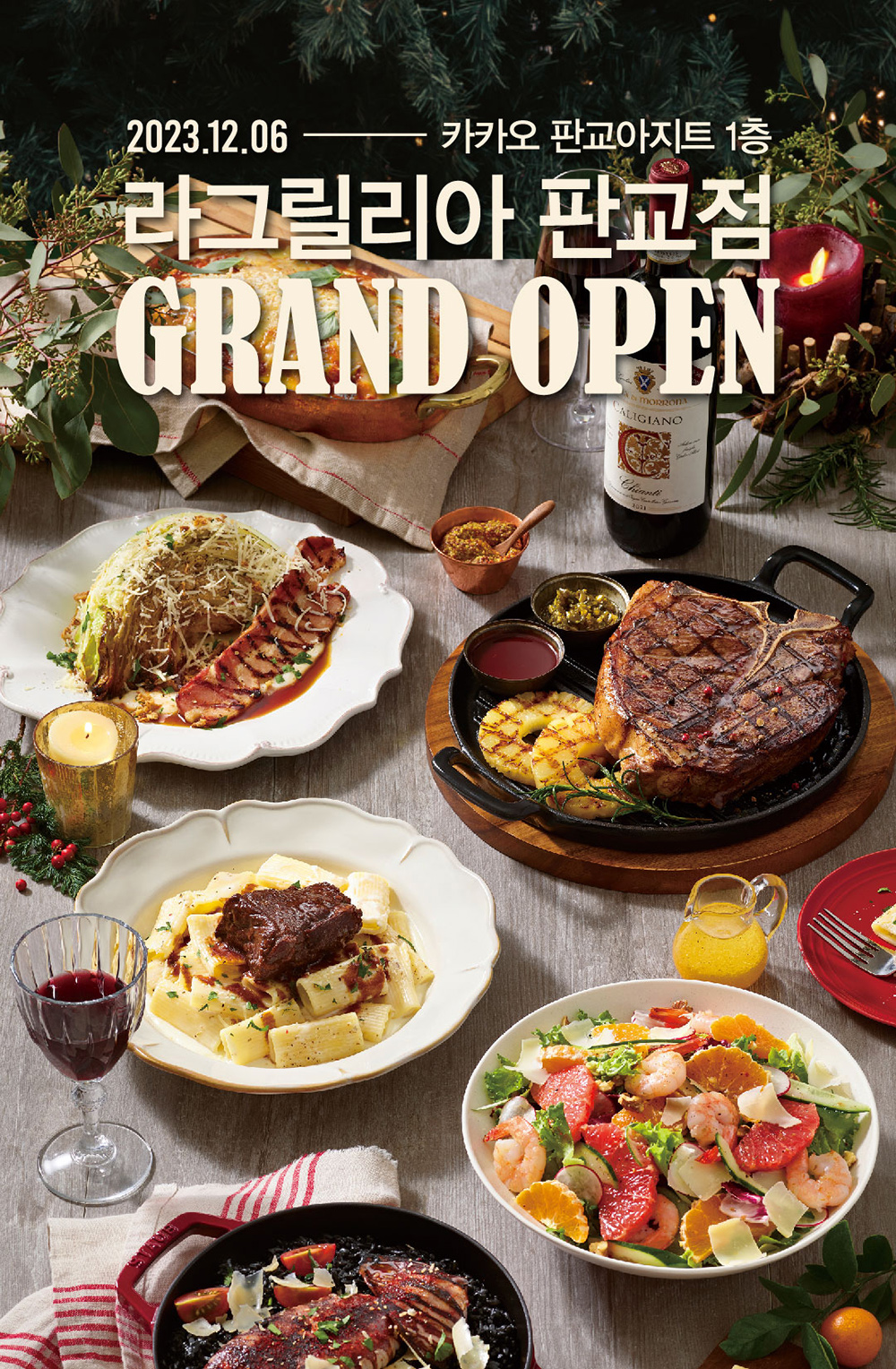 한편, 라그릴리아 판교점은 오픈을 기념하여 다양한 이벤트를 진행한다. 먼저 해피포인트 애플리케이션(해피앱)에서 12월 22일까지 쿠폰 다운로드 고객을 대상으로 5만원/8만원 이상 주문 시 ‘에그 시저 샐러드’, ‘마르게리따 피자’를 증정한다.