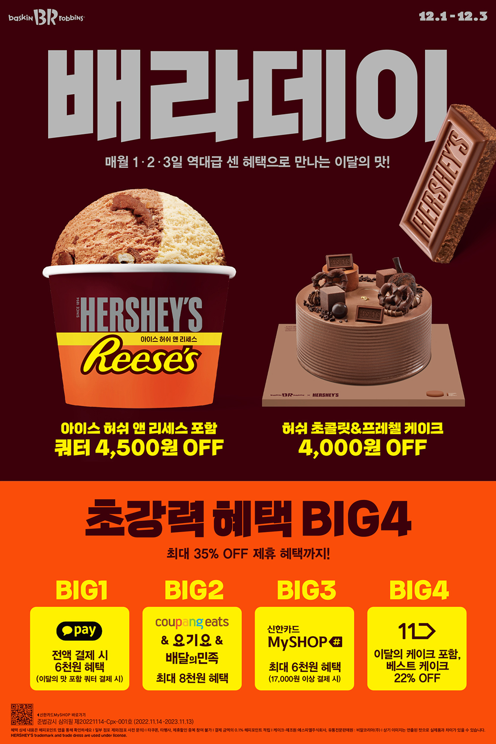 12월 1, 2, 3일 총 3일간 진행되는 ‘배라데이’는 12월 이달의 맛 ‘아이스 허쉬 앤 리세스’를 대상으로 다양한 혜택을 제공한다. 신제품 ‘아이스 허쉬 앤 리세스’는 글로벌 초콜릿 브랜드 ‘허쉬(HERSHEY’S)’, 허쉬의 피넛버터 브랜드 ‘리세스(REESE’S)’와 협업해 탄생한 제품으로 겨울 시즌에 어울리는 깊고 진한 달콤함을 선사한다.