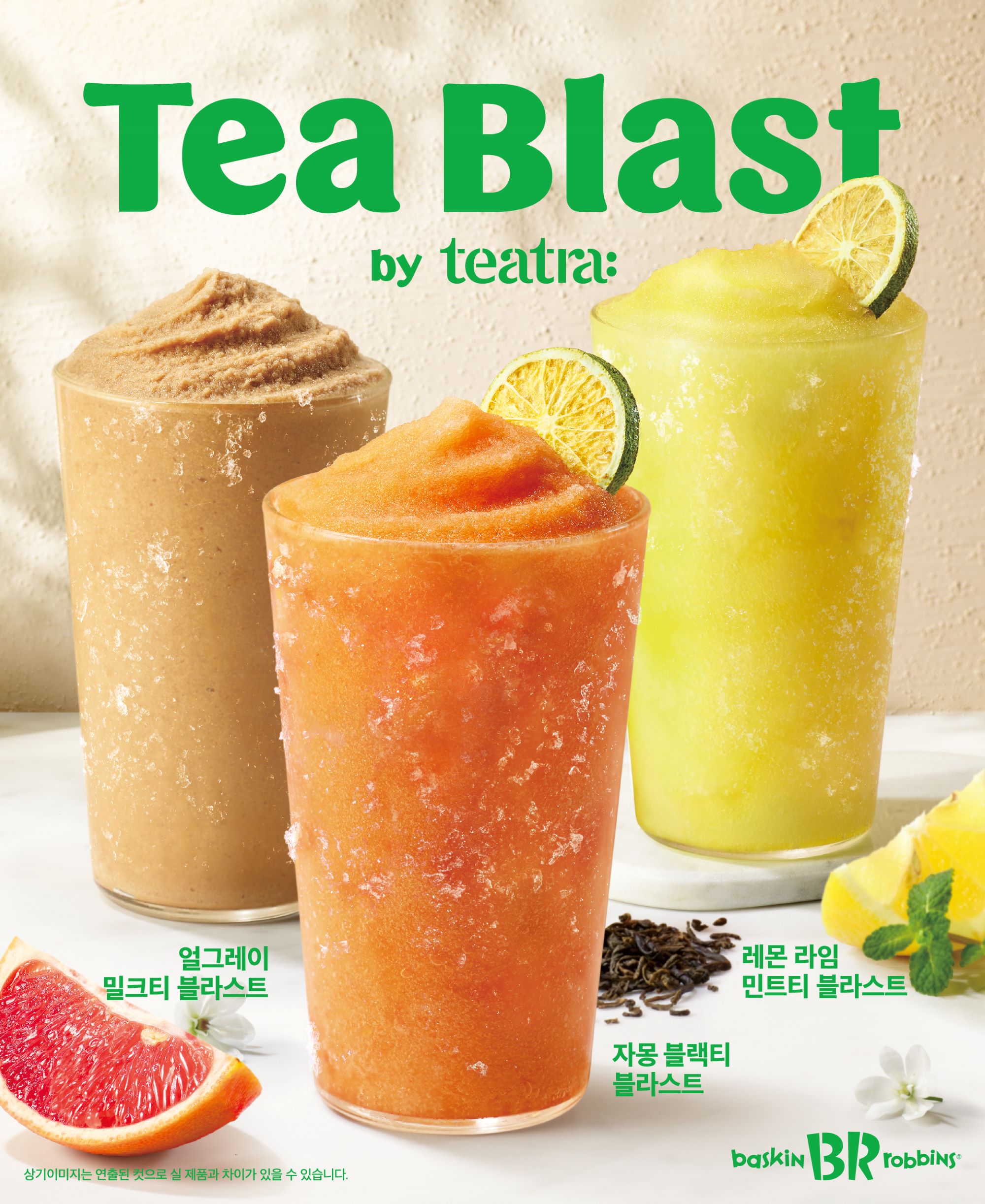 ‘티 블라스트’ 3종(△얼그레이 밀크티 △자몽 블랙티 △레몬 라임 민트티)은 풍미 가득한 티트라의 티를 원료로 사용해 트렌디한 블렌딩 티 제품을 배스킨라빈스만의 블라스트로 시원하게 즐길 수 있는 점이 특징이다. 풍부한 향이 가득 느껴지는 티와 새콤달콤 과일을 블렌딩하여 블라스트로 구현해 봄•여름 시즌 싱그러운 리프레쉬 음료로도 제격이다.