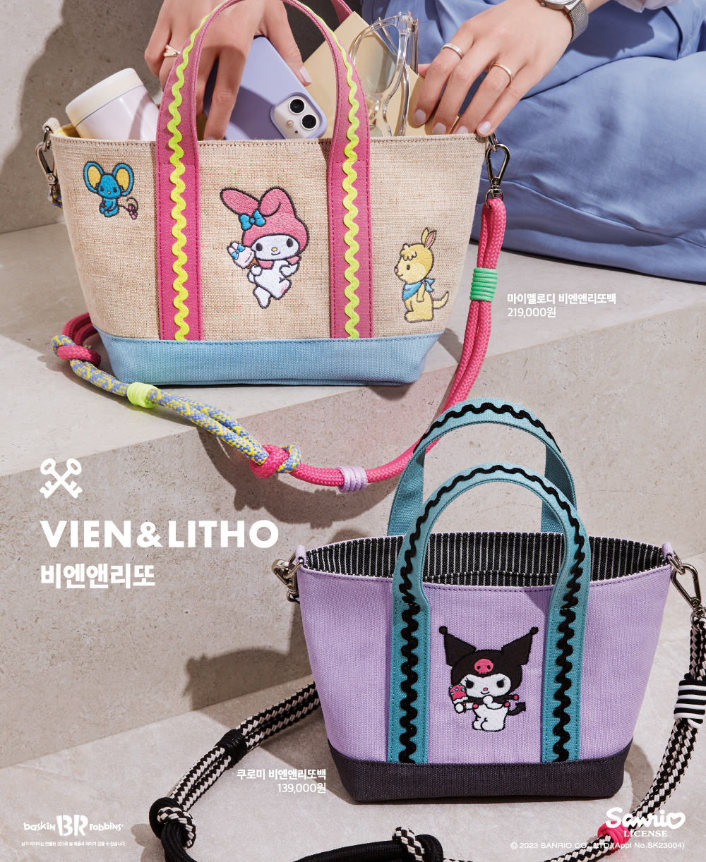배스킨라빈스는 커스텀 백으로 유명한 ‘비엔앤리또(Vien and Litho)’와 손잡고 산리오 캐릭터 ‘마이멜로디(M 사이즈, 219,000원)’, ‘쿠로미(S 사이즈, 139,000원)’를 자수로 새긴 ‘산리오캐릭터즈 비엔앤리또 백’ 2종을 선보였다. ‘비엔앤리또’는 특유의 자수 디테일과 유니크한 컬러 조합이 특징인 프리미엄 가방 브랜드로, 상시 판매가 아닌 시즌 별 컬렉션을 출시해 희소성이 높은 제품으로 유명하다.