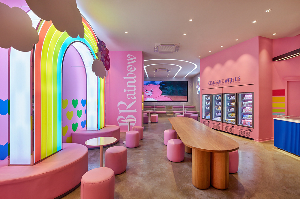 서현로데오점은 케어베어의 알록달록한 색상에서 영감을 얻은 ‘레인보우 원더랜드(Rainbow Wonderland)’ 콘셉트를 적용, 케어베어 곰돌이들과 함께 무지개를 타고 떠나는 환상적인 모험을 시각적으로 구현했다.
