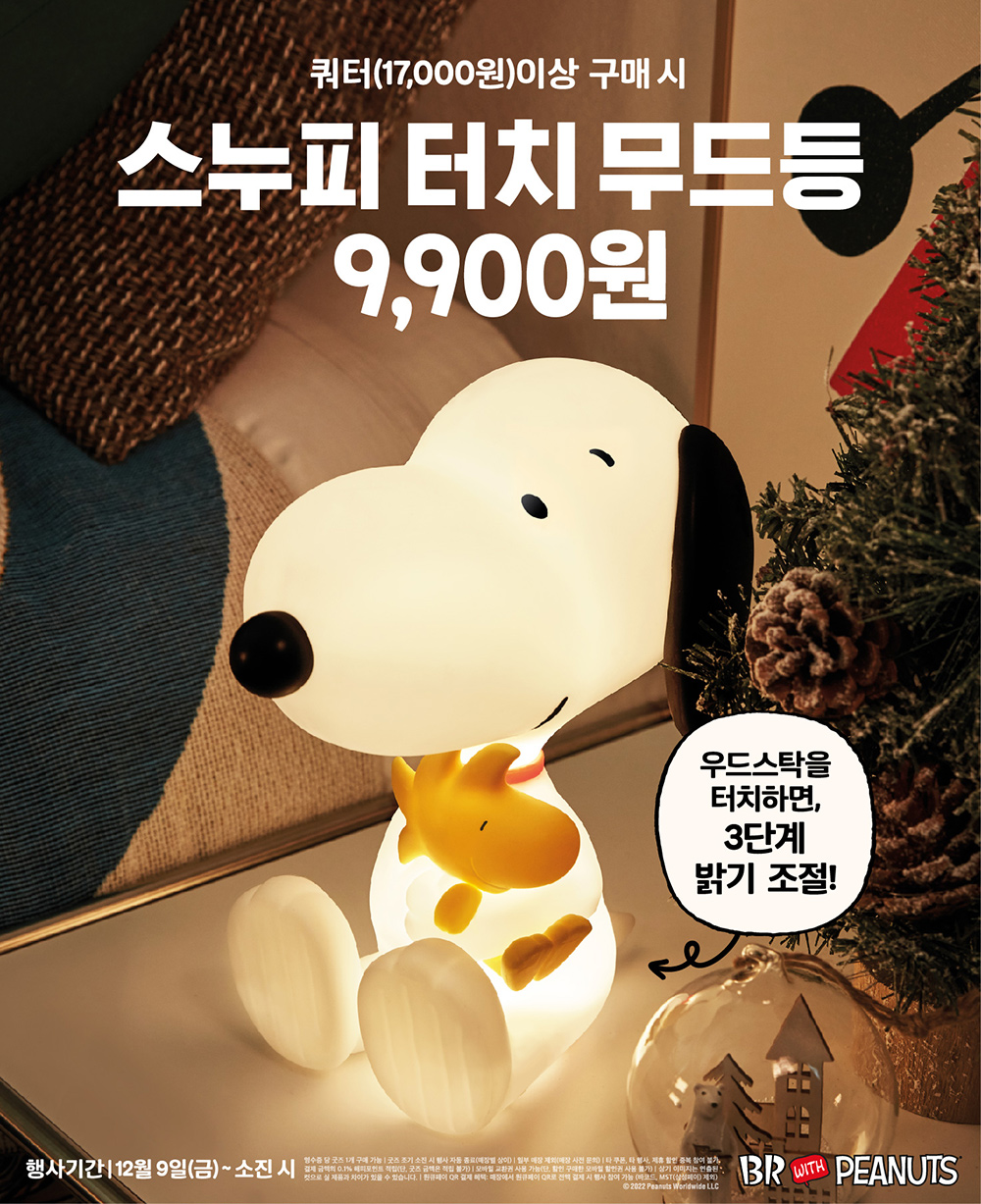 SPC그룹이 운영하는 배스킨라빈스가 글로벌 캐릭터 스누피로 유명한 ‘피너츠(Peanuts)’와 협업해 행복한 크리스마스를 완성할 ‘스누피 터치 무드등’을 출시한다고 29일 밝혔다.