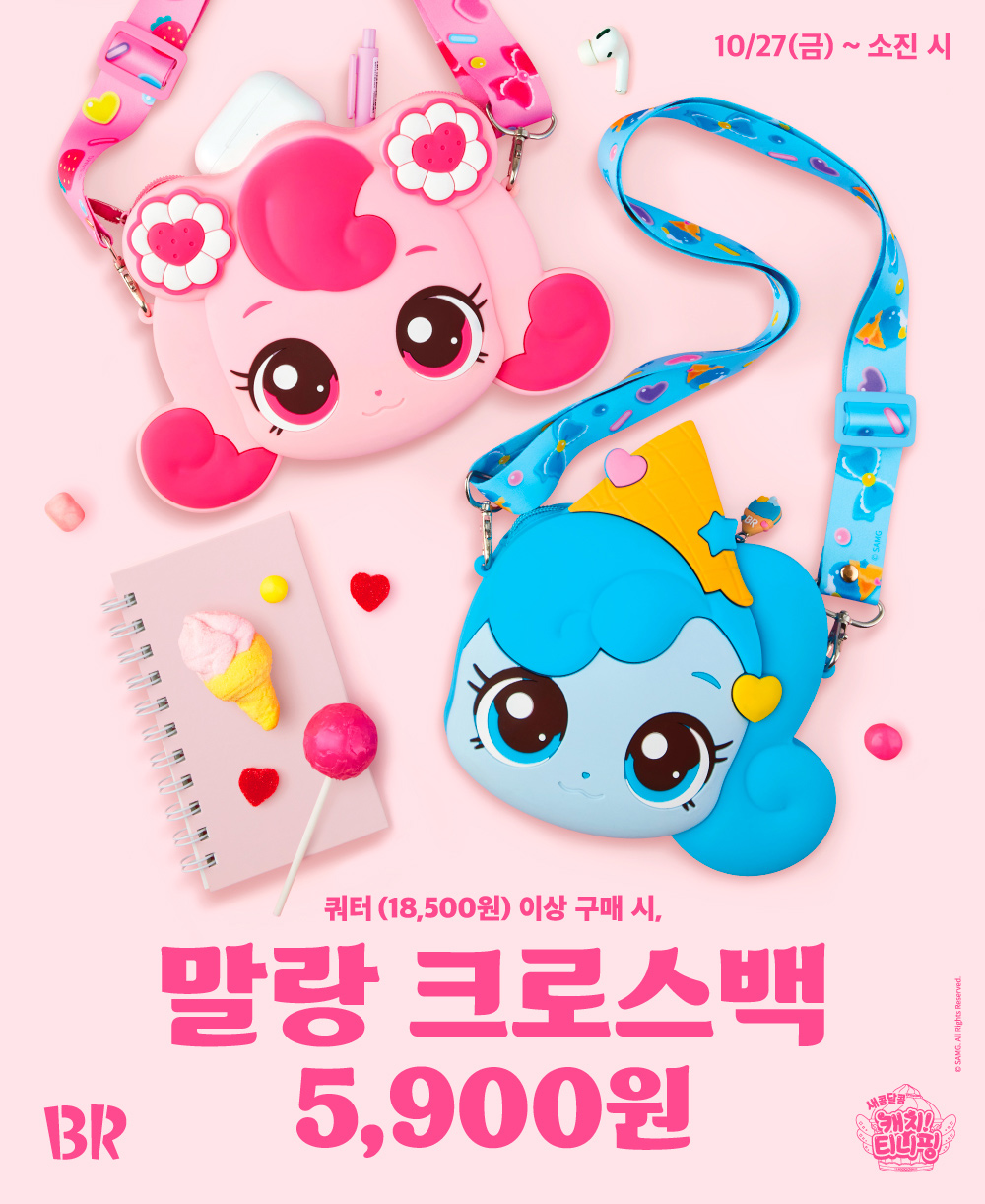 배스킨라빈스는 굿즈를 출시하고 오는 18일부터 26일까지 사전예약 프로모션을 진행한다. 해당 기간 내 해피오더 애플리케이션(해피앱), 카카오톡 주문하기를 통해 쿼터(18,500원) 사이즈 이상 구매 시 ‘캐치! 티니핑 말랑 크로스백’ 2종 중 1천원 가격 혜택이 적용된 4,900원에 구매할 수 있다. 또한, 27일부터는 오프라인 매장에서 쿼터 이상 구매 고객을 대상으로 5,900원에 판매한다. (단, 굿즈 소진 시 행사는 자동 종료)
