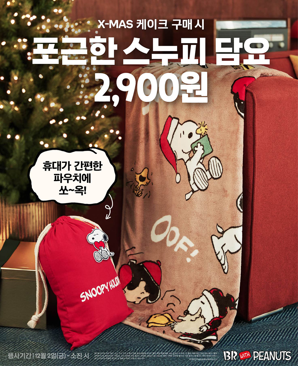 SPC그룹이 운영하는 배스킨라빈스가 글로벌 캐릭터 스누피로 유명한 ‘피너츠(Peanuts)’와 협업해 따뜻한 크리스마스를 완성할 ‘포근한 스누피 담요’를 출시한다고 28일 밝혔다.