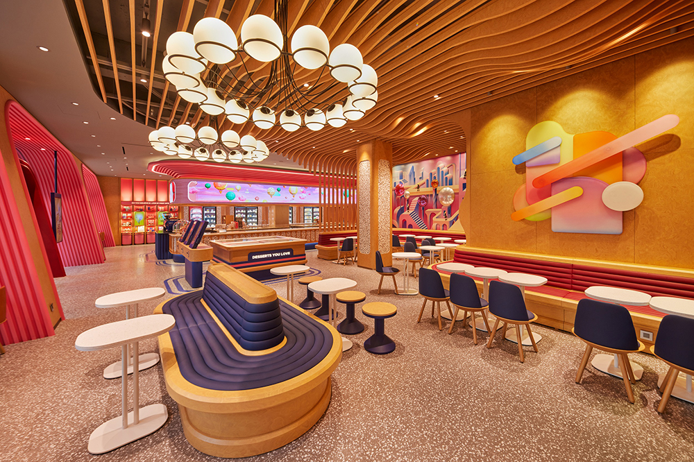 특히, 총 100가지 맛의 아이스크림 컬렉션을 제공하는 매장의 특성을 살려 다양한 플레이버를 열기구로 형상화해 시각적 즐거움을 더하고, 판타지 동화 같은 분위기를 완성했다. 매장 중앙에 설치된 대형 디지털 메뉴보드를 통해서는 아이스크림을 상징하는 캐릭터들이 퍼레이드를 펼치는 Full 3D 애니메이션도 생생하게 즐길 수 있다. 반대편 디지털 보드에도 퍼레이드를 준비하는 캐릭터 모습을 담은 백 스테이지 장면을 연출해 마치 환상의 나라에 방문한 듯한 기분을 선사한다.