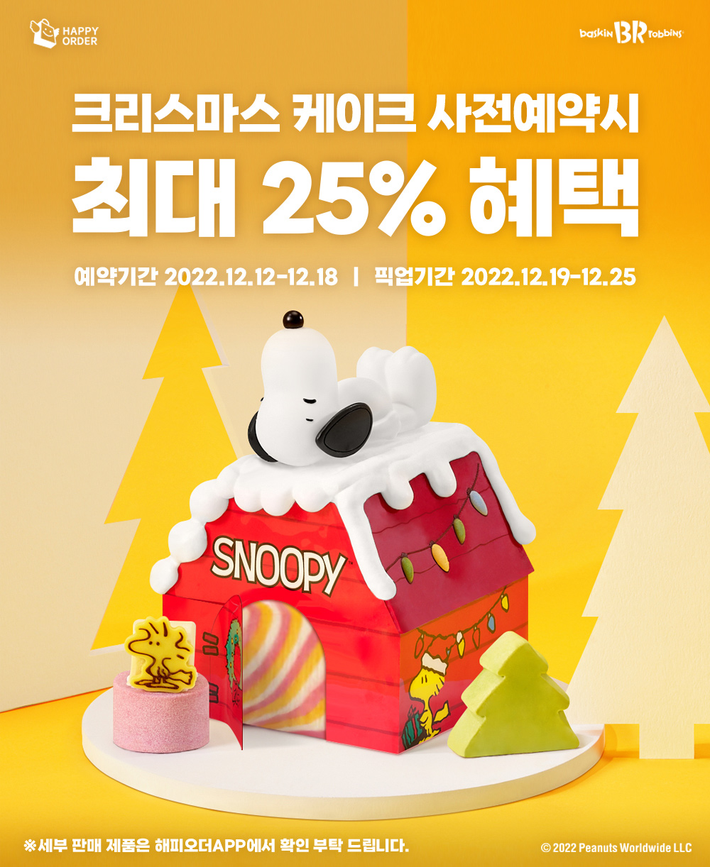 한편, 배스킨라빈스는 스누피로 유명한 애니메이션 ‘피너츠(Peanuts)’와 협업해 ‘해피 스누피 홀리데이’를 테마로 한 2022년 크리스마스 케이크 22종을 출시했다. 대표 제품은 △스노우 볼을 올린 스누피 관람차를 돌릴 수 있는 대관람차 모양의 ‘빙그르르! 스누피 대관람차’ △빨간 메일박스 속 초콜릿 볼을 초콜릿 이글루를 안으로 날릴 수 있는 ‘스누피의 슈팅 초코볼’ △크리스마스 트리 모양의 아이스크림 케이크로 상단의 별을 돌리면 초콜릿 볼이 쏟아지는 ‘와르르! 스누피 위시 트리’ 3종이다.