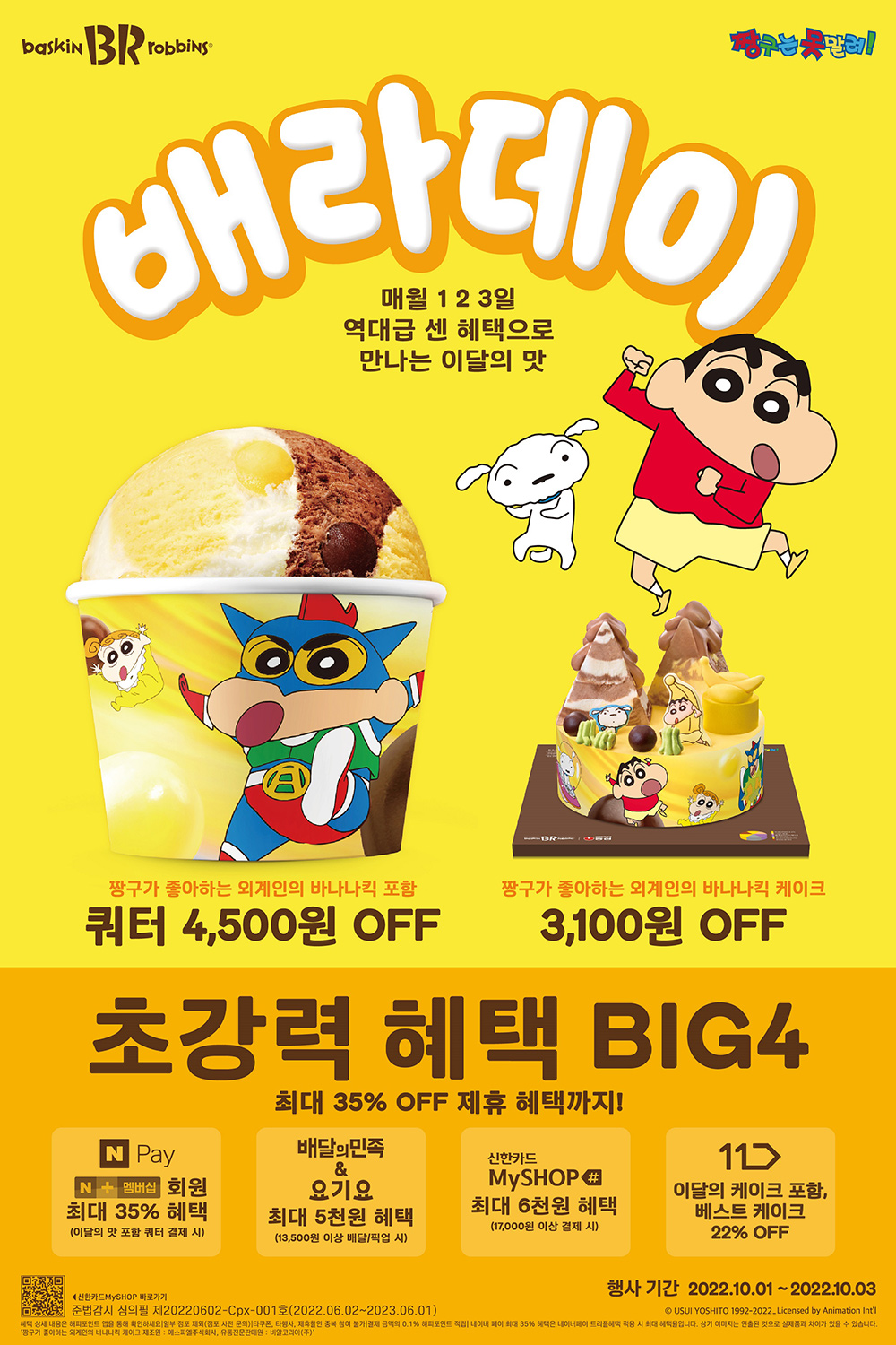 이외에도, 배스킨라빈스는 신한카드 마이샵(MySHOP)에서 캐시백 혜택 쿠폰 2종을 발급받은 고객을 대상으로 17,000원 이상 구매 시 최대 6천 원의 청구 할인 혜택을 적용해준다. 또, 10월 배라데이를 맞아 새롭게 제휴를 맺은 ‘11번가’에서는 이달의 케이크 ‘짱구가 좋아하는 외계인의 바나나킥 케이크’, 배스킨라빈스 스테디셀러 케이크 2종 ‘듀얼 와츄원 NO.9’과 ‘리얼 27 큐브’ 구매 시 22% 혜택을 전한다.