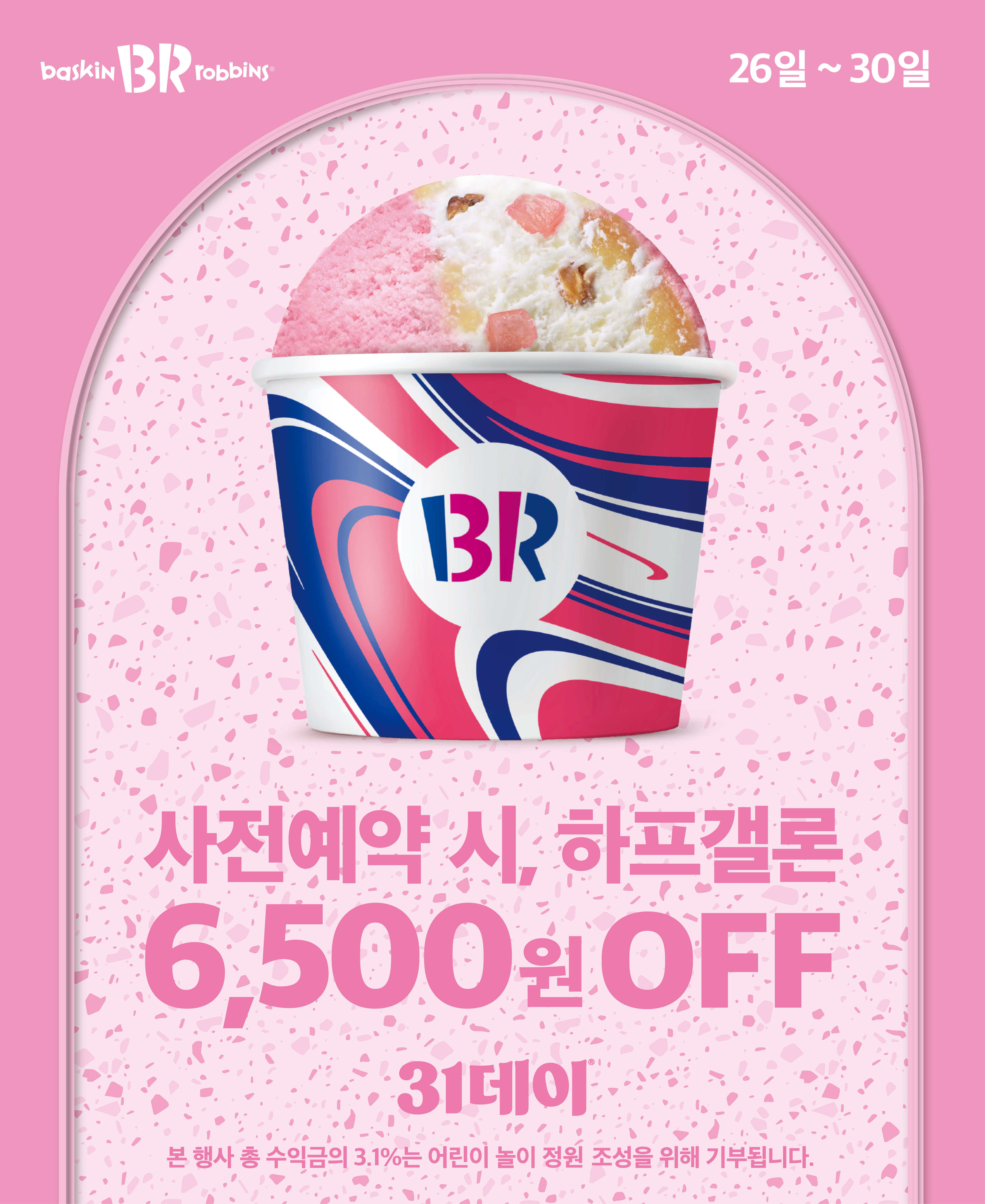 배스킨라빈스는 이번 ‘31데이’를 통해 사전예약 할인 혜택과 매장 방문 이벤트를 통해 고객들에게 특별한 경험을 선사할 예정이다. 26일부터 30일까지 해피포인트, 해피오더 앱 또는 카카오톡 예약하기를 통해 하프갤론(31,500원) 사이즈를 사전 예약하면 1천 원 추가 혜택을 더해 총 6,500원 상당의 가격 혜택을 받을 수 있다.