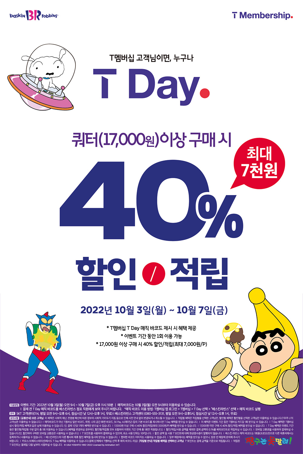 ‘T Day 프로모션’ 기간 동안 배스킨라빈스 오프라인 매장에서 결제 시, T 멤버십 애플리케이션(앱) 내 ‘배스킨라빈스 매직 바코드’를 제시하면 참여 가능하다. SKT T 멤버십 가입자라면 등급에 관계 없이 누구나 혜택을 받을 수 있고, 자세한 내용은 배스킨라빈스 공식 홈페이지 및 T 멤버십 앱에서 확인 가능하다.