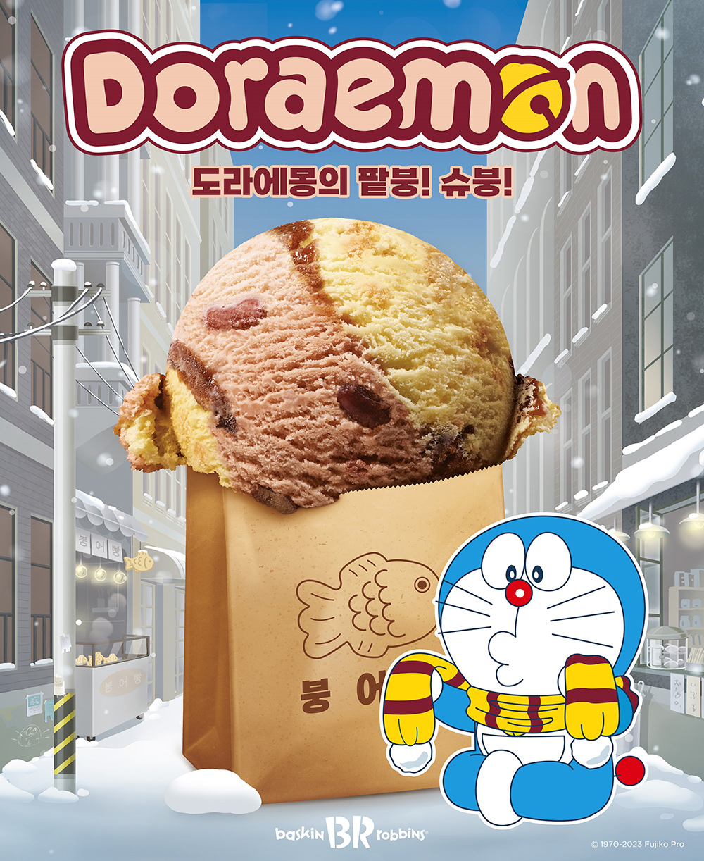 성큼 다가온 겨울에 어울리는 ‘도라에몽의 팥붕! 슈붕!’은 쌀쌀해지면 생각나는 붕어빵과 팥을 콘셉트로, 달콤한 팥과 슈크림 아이스크림 조합에 풍미를 높여줄 팥앙금 리본과 통단팥, 그리고 식감을 더해줄 바삭한 버터 쿠키로 완성했다. ‘팥붕파’와 ‘슈붕파’ 논쟁을 종식시킬 플레이버로, ‘붕세권(붕어빵과 세력권을 합친 신조어)’이라는 말이 나올 정도로 겨울철 인기 간식인 붕어빵을 배스킨라빈스에서 색다르게 즐길 수 있는 것이 특징이다.