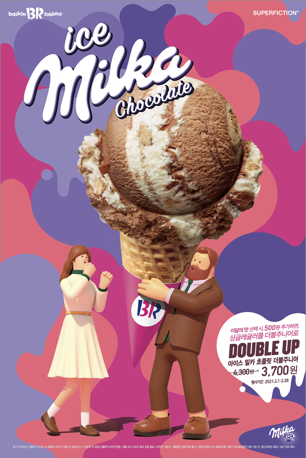 이번 신제품은 2월 발렌타인 시즌을 맞아 ‘BIG LOVE’ 콘셉트를 적용했으며, 크리에이티브 디자인 스튜디오가 선보인 ‘슈퍼픽션’의 캐릭터 ‘프레디’가 ‘셀린’에게 ‘아이스 밀카 초콜릿’으로 사랑을 고백하는 스토리를 달콤하게 그려냈다.