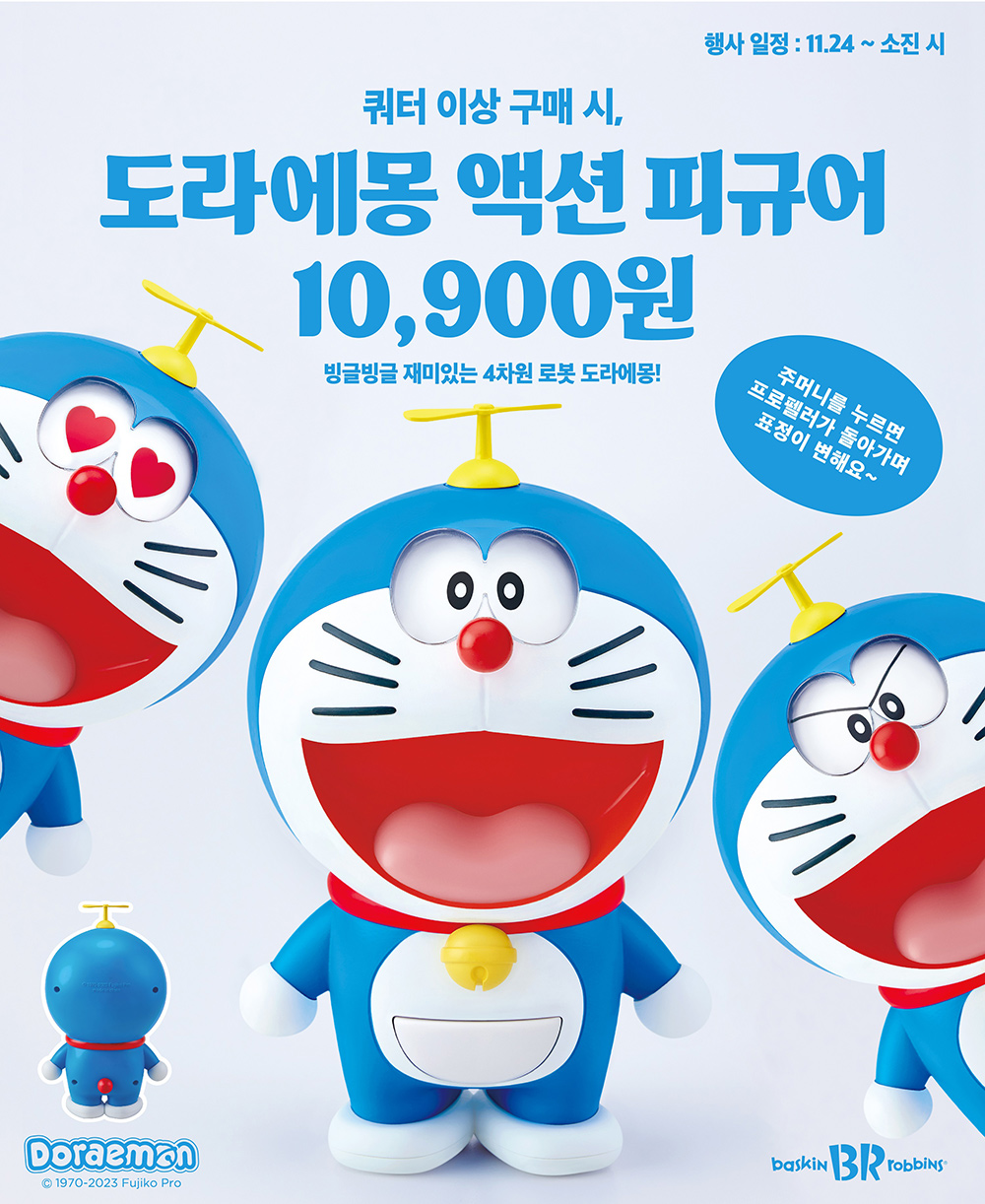 한편, 도라에몽은 미래에서 온 고양이형 로봇 ‘도라에몽’이 4차원 주머니에서 꺼낸 신비하고 재미있는 비밀도구를 활용해 소년 진구에게 도움을 주며 벌어지는 이야기를 담은 만화다. 배스킨라빈스는 50여 년간 남녀노소 사랑을 받아온 글로벌 인기 캐릭터 ‘도라에몽’과 협업해 11월 이달의 맛 ‘도라에몽의 팥붕! 슈붕!’을 출시하는 등 다양한 마케팅 활동을 펼칠 예정이다.