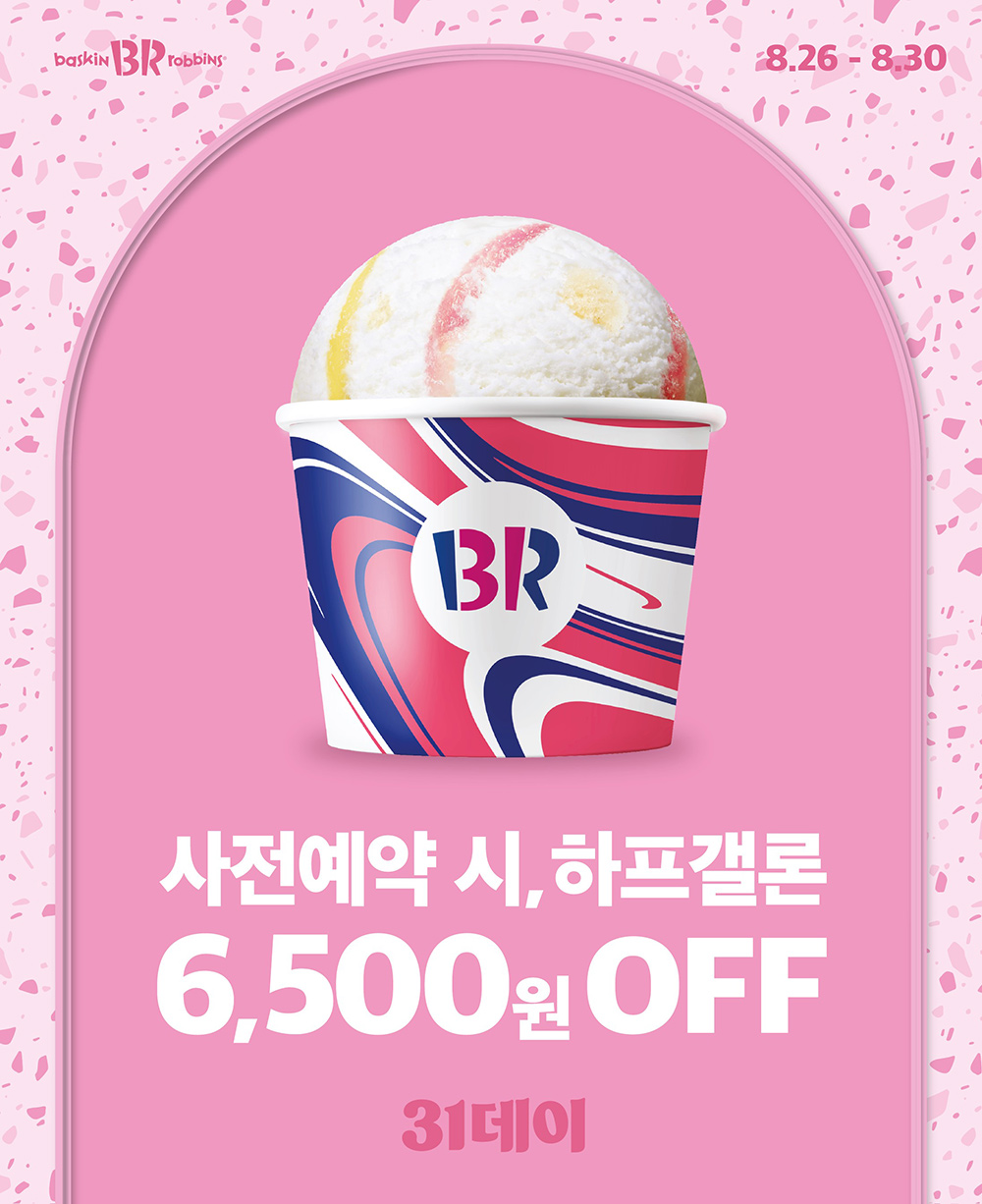 8월 ‘31데이’는 오는 31일 하루 동안 패밀리를 하프갤론으로 사이즈 업그레이드 해주는 것은 물론, 사전예약 혜택까지 시원하게 제공하는 행사다. 사전 예약 프로모션은 26일부터 30일까지 해피오더 애플리케이션, 카카오톡 주문하기를 통해 참여할 수 있다. 사전 예약 시 하프갤론을 총 6,500원 가격 혜택을 적용해 구매할 수 있으며, 픽업은 행사가 진행되는 31일에 가능하다.