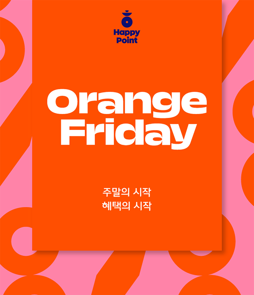 ‘오렌지 프라이데이’는 ‘주말의 시작, 혜택의 시작’을 테마로, 회사원, 학생 등 ‘부캐(부캐릭터)’로 살던 평일을 지나 진짜 ‘나’를 만날 수 있는 주말의 시작인 금요일을 맞아 풍성한 혜택을 선사하는 행사다. 특히, 해피포인트의 브랜드 컬러인 ‘오렌지’를 활용해 밝고 경쾌한 느낌과 행복한 감정을 고객에게 전하고자 했다.