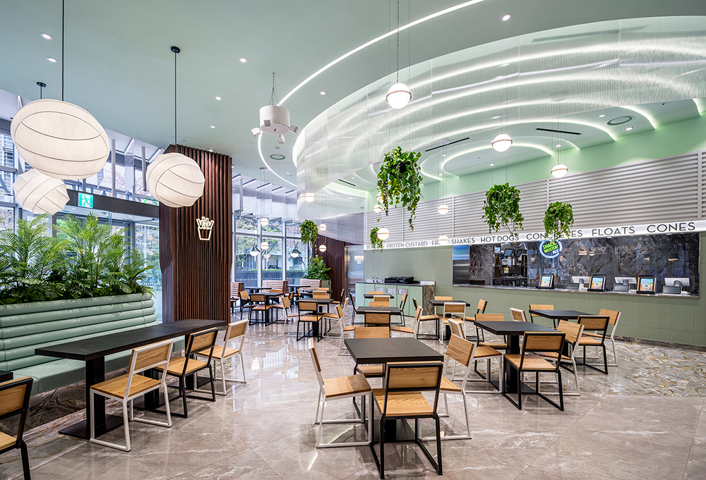쉐이크쉑 부산센텀점은 완벽한 첨단도시를 의미하는 ‘센텀시티’에서 영감을 받아 빛의 효과를 통한 공간구성에 초점을 맞췄다. 특히, 빛의 파동 모양에서 영감을 받은 여러 겹의 특수 제작한 조명이 매장 전체를 비춰 미래지향적인 첨단도시인 센텀시티의 모습을 표현했다.