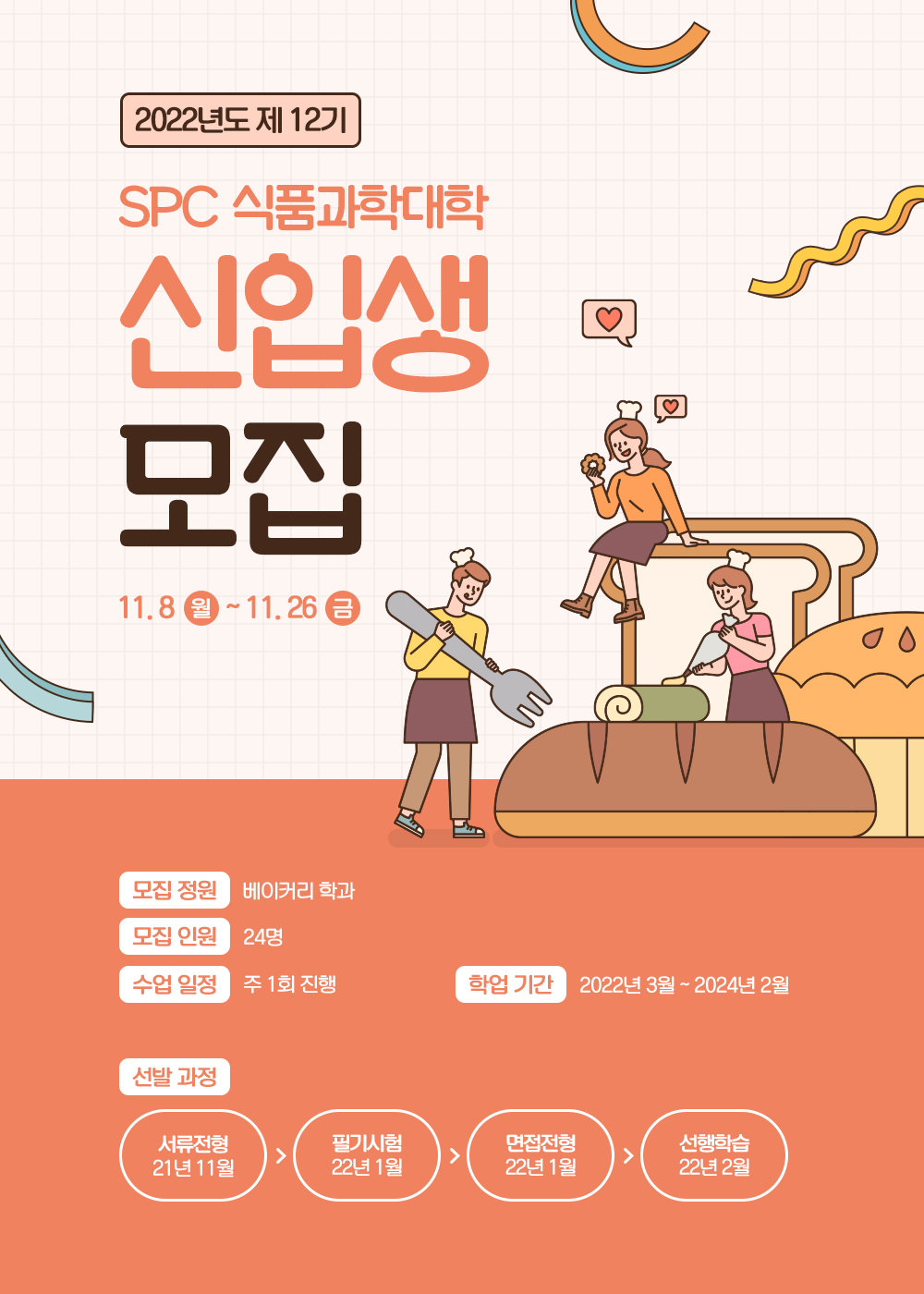 2022학년도 신입생 모집 부문은 베이커리학과 정원 24명으로, 입학 시 2022년 3월부터 2024년 2월까지 2년간 전문학사과정을 이어가게 됩니다. 수업은 매주 화요일 오전 9시부터 오후 8시까지 진행될 예정입니다. 고등학교 졸업 이상 학력을 가진 근무경력 1년 이상의 임직원이라면 누구나 입학을 지원할 수 있는데요. 온라인 지원 사이트(https://spc-cofs.kr)에 입학지원서와 자기소개서, 사내외 자격증 사본을 제출하면 지원이 완료됩니다. 원서 접수는 2021년 11월 8일부터 11월 26일까지 3주간 이뤄지는데요. 11월 서류 전형을 거쳐 내년 1월에 필기시험과 면접이 진행되며, 2월부터는 선행학습이 시작됩니다.