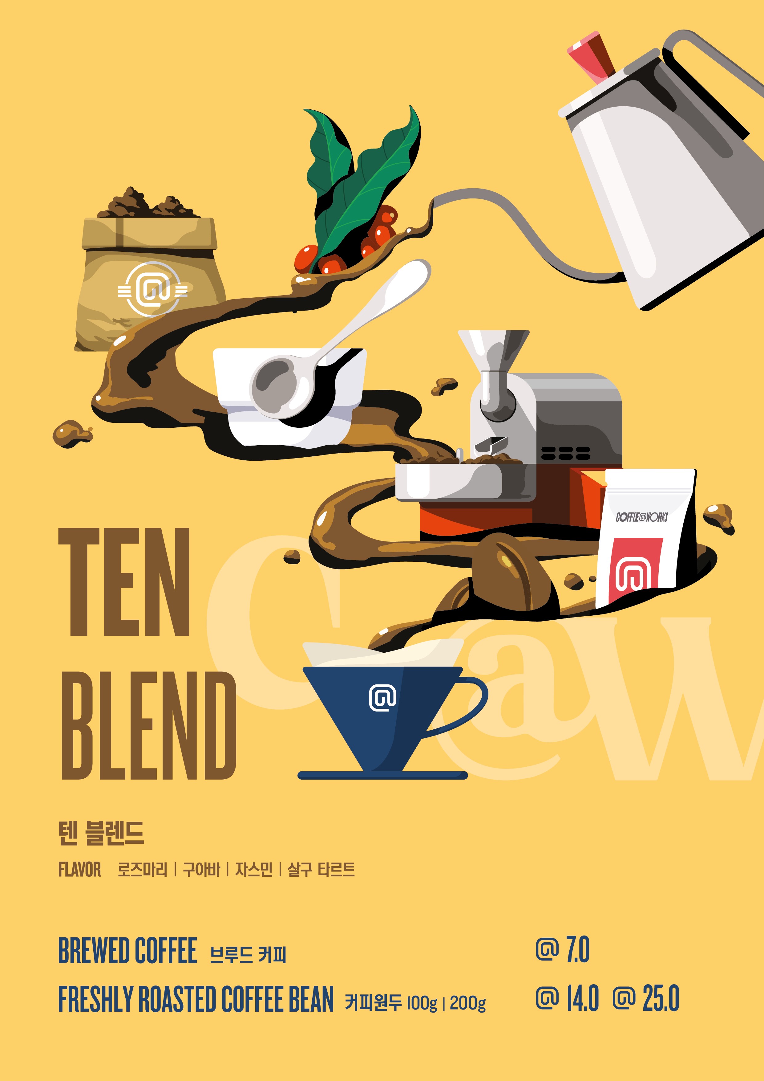 신제품 2종은 커피앳웍스 전 매장에서 만나볼 수 있으며, 이 중 ‘텐 블렌드’는 △브루잉 커피 (7,000원) △드립백(2,000원) △원두(100g 14,000원, 200g 26,000원)로 다양하게 즐길 수 있다. 10주년을 기념해 10개입으로 출시하는 드립백은 새로운 일러스트가 그려진 드립백 박스와 함께 제공된다. 일러스트는 일러스트레이터 ‘싸비노’와 협업해 완성했으며, 따뜻한 노란색 바탕에 10년간 커피앳웍스 브랜드 여정을 담은 디자인이 특징이다.