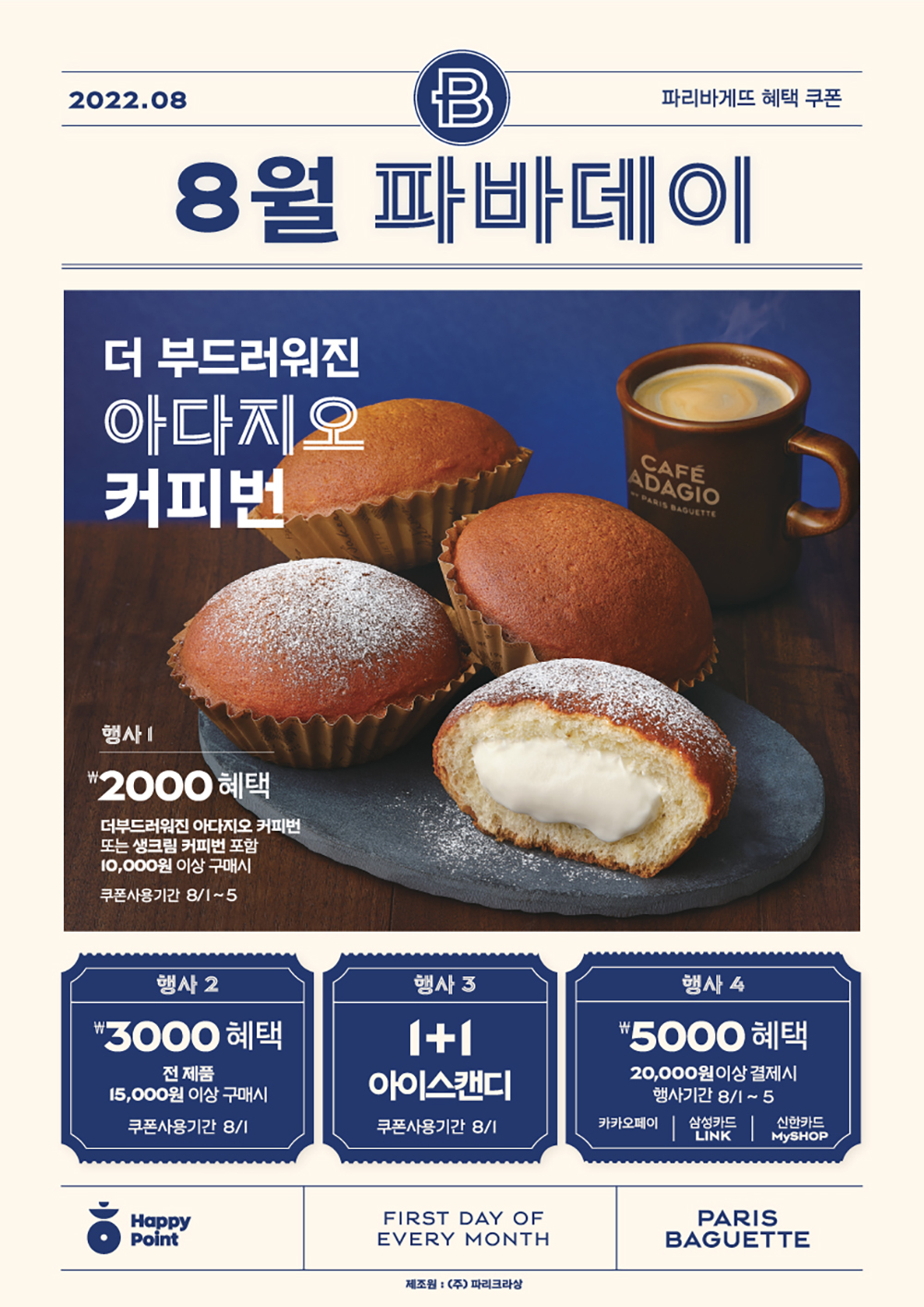 이번 달 프로모션 제품은 △아다지오 원두의 깊고 진한 커피와 버터 풍미를 느낄 수 있는 ‘아다지오 커피번’ △아다지오 원두로 만든 깊은 풍미의 커피번에 부드러운 생크림을 듬뿍 담은 ‘아다지오 생크림 커피번’으로, 8월 1일부터 5일까지 프로모션 제품 포함 1만원 이상 구매 시 2천원 혜택 쿠폰을 제공한다.