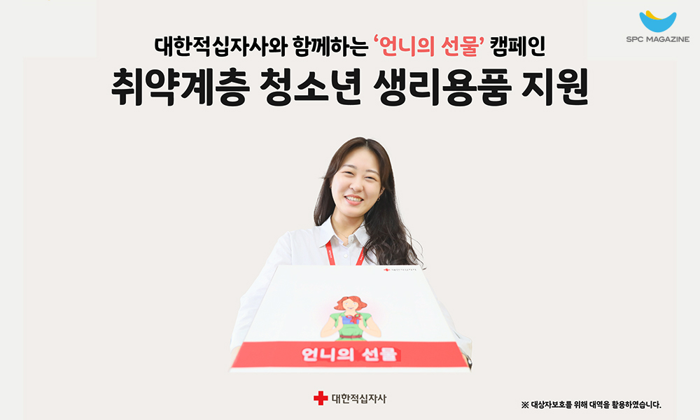 SPC는 소외된 이웃들을 위한 사회공헌 활동의 일환으로 SPC해피쉐어 캠페인을 진행하고 있습니다. SPC해피쉐어 캠페인은 온라인 사회공헌 사업으로, 2017년부터 약 10만 명의 고객과 함께 한부모가정 생계비, 긴급의료비, 취약가정 주거 환경개선, 자립준비청년 첫 살림 지원, 무연고 아동 등 180여 명에게 약 2억 원을 지원해 왔는데요. 10월 19일부터 대한적십자사와 함께 복지사각지대의 취약계층 청소년에게 생리용품을 지원하는 ‘언니의 선물’ 캠페인을 진행하고 있습니다. 이번 프로그램은 2016년 생리대 대신 깔창을 사용했던 ‘깔창 생리대’ 사례를 비롯해 경제적으로 생리용품 구입에 어려움을 겪는 청소년을 지원하기 위해 기획됐는데요. 최대 5천 명의 응원 참여를 목표로 11월 15일까지 진행됩니다.