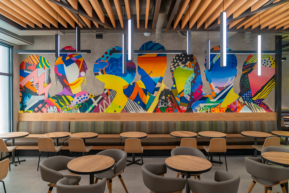 The store’s interior design was faithfully reproduced from the original Los Angeles store, with its unique neon logo and open kitchen. It also features the mural art collaborated with graffiti artist Xeva who expressed Eggslut’s positive energy into splendid colors.