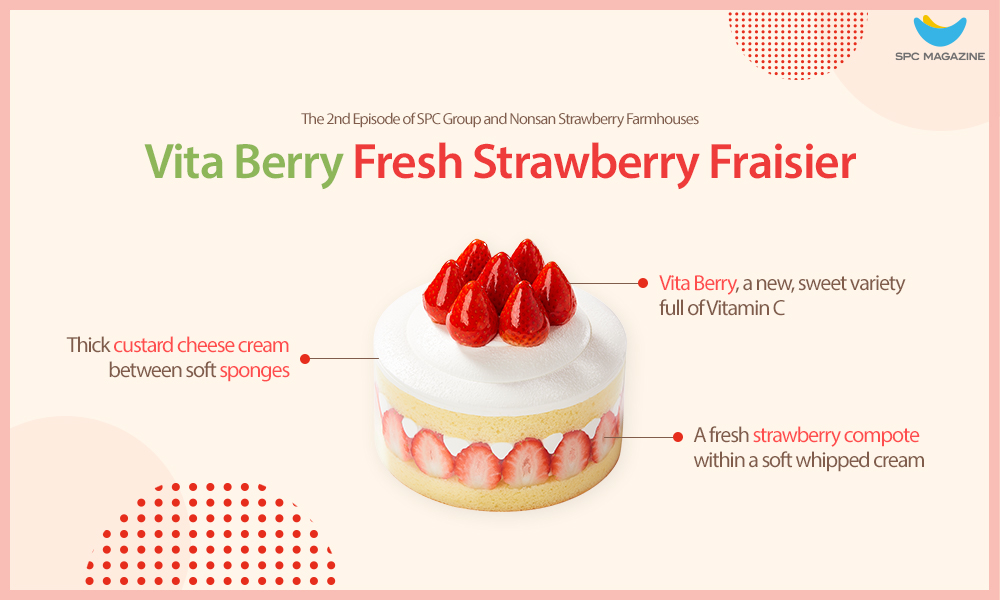 Paris Baguette, a family brand of SPC Group, launched a French-style cake using a high-quality Vita Berry to allow customers to elegantly enjoy the taste of strawberry. We introduce ‘Vita Berry Fresh Strawberry Fraisier.’ Fraisier is a French dessert made with sweet and soft custard cream, soft sponge cake sheets, and a fresh strawberry.