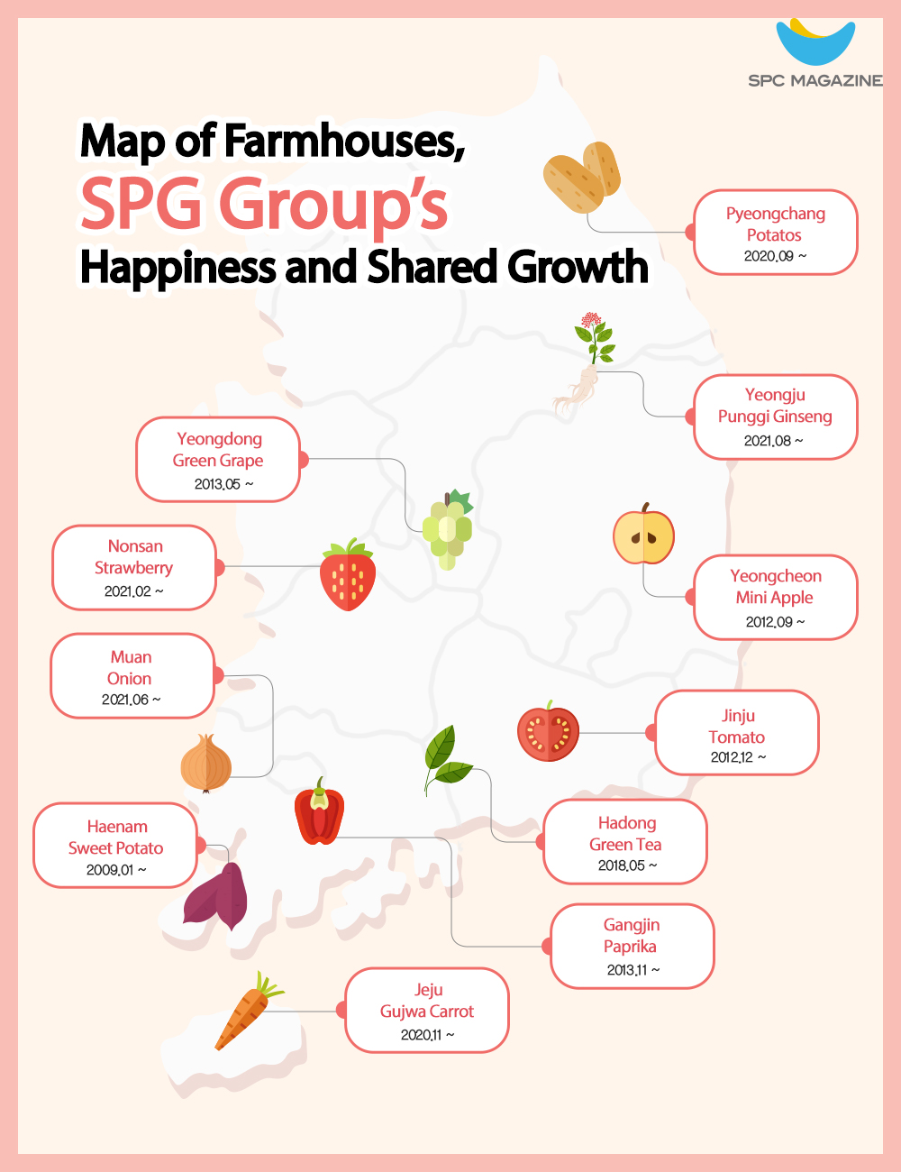 SPC is willing to push hard for franchise ESG management that can reward our customers with even better products and make contributions to our society. SPC Group’s Happiness and Shared Growth Project is a representative shared growth model that realizes such intention. The Group’s effort in shared growth with local societies dates to 2009. It was not until 2020 that the project was named as ‘Happiness and Shared Growth Project’ and really started to generate shared values. Throughout last year, the Group signed shared growth agreements with local farms including Nonsan strawberry farmhouse in February, Muan onion farmhouse in June, and Punggi Ginseng farmhouse in August; it launched unique new products using domestic farm produce.