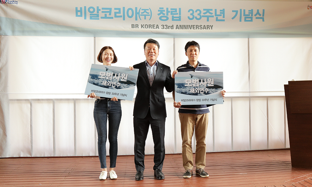 모범사원과 장기 근속자 포상도 진행되었습니다. 5년, 10년, 15년, 그리고 20년 동안 비알코리아와 함께해준 직원들의 이름이 차례로 스크린에 떠오르고, 해외 여행권을 비롯해 그동안 열심히 일해준 직원들에 대한 고마움을 담은 포상이 이어졌습니다. 20년 동안 근속한 BR생산센터 오희섭부장님이 수상자들을 대표해 소감을 발표해주셨습니다. 500개의 아이스크림 케이크로 시작해 이제는 3만 개를 만들게 된 감회가 남다르다며, 오랜 시간 동안 비알코리아와 함께 할 수 있었던 공을 좋은 선배와 후배들에게 돌렸습니다.