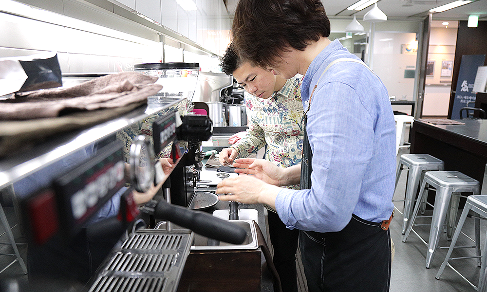 어린 시절 삶을 의미 있게 해주는 것을 찾지 못해 방황하던 시절, 우연한 기회에 일하게 된 카페에서 자신이 만든 커피를 좋아해 주는 손님을 만나게 된 것을 계기로 커피를 시작했다는 이자키 히데노리. 커피에 대한 그의 열정과 이러한 열정을 하나도 빠짐없이 고스란히 학생들에게 전하려는 그의 진심이 느껴지는 수업 현장이었습니다. 또한, 그는 커피는 나이, 성별, 배경이나 문화의 차이를 넘어 사람들을 하나로 묶어주고 소통하게 해준다고 강조했는데요.