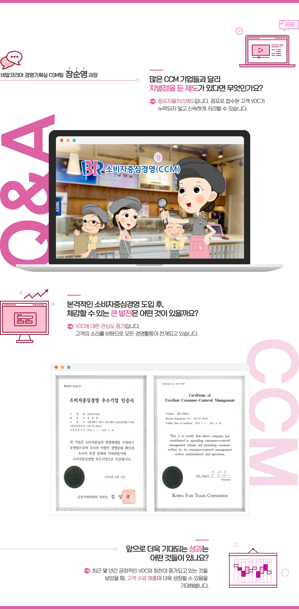 비알코리아는 대내·외 홍보, VOC 사전 예방, 소비자 불만 관리 등의 항목에서 좋은 평가를 얻었습니다. 특히 CCM 제도의 의의를 모든 임직원과 점포 근무자들 공유할 수 있도록 다각적인 방면으로 교육을 진행하고 있습니다.