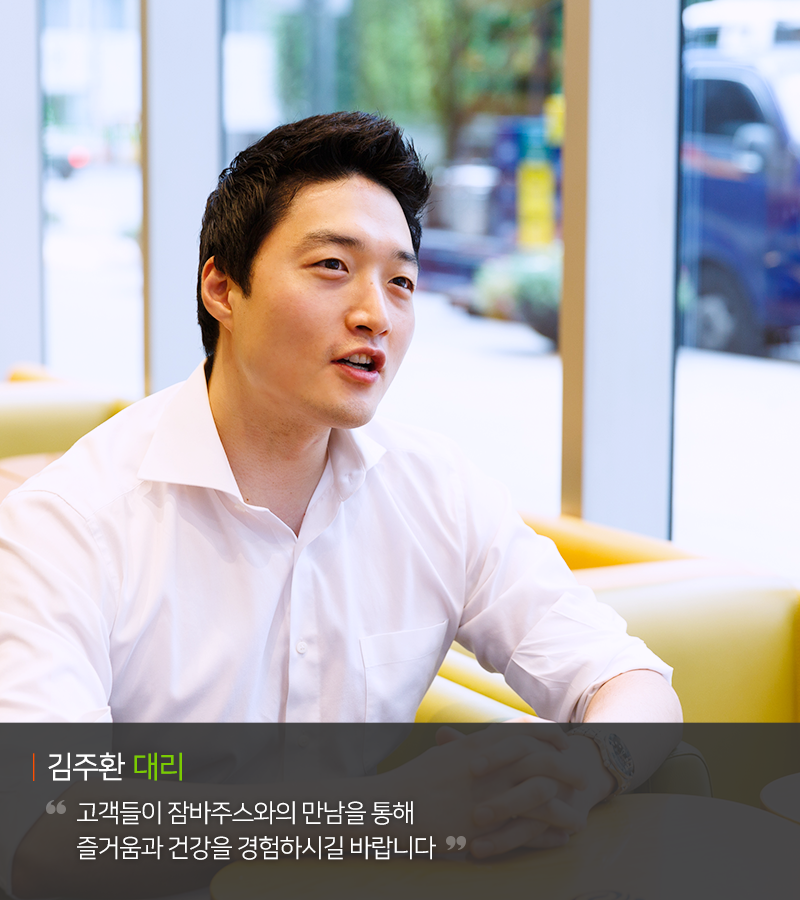 잠바주스 직영 슈퍼바이저 임무를 수행하고 있는 김주환 대리입니다. 직영점의 출점지 검토부터 계약, 매출관리, 손익관리, 인원관리까지 영업에 관련된 전반적인 업무를 담당하고 있습니다.