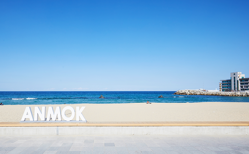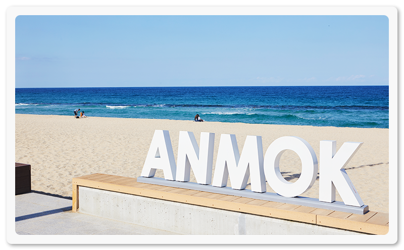 “매장에서 커피 한잔의 여유를 즐기는 것도 정말 좋지만, 만약 바람이 적고, 맑은 날이라면 해변으로 나가는 것을 적극 추천 드립니다. ‘ANMOK’ 표지판은 안목 해변을 찾는 분들이라면 한 번씩 기념사진을 남기는 곳이랍니다.”