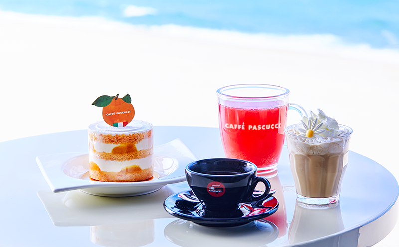 l 파스쿠찌에서 판매 중인 제품들 (왼쪽부터 오렌지블러썸 미니케익, 에스프레소 도피오, 루비자몽 핫주스, 피오르 디 라떼)