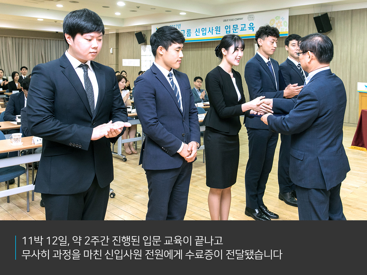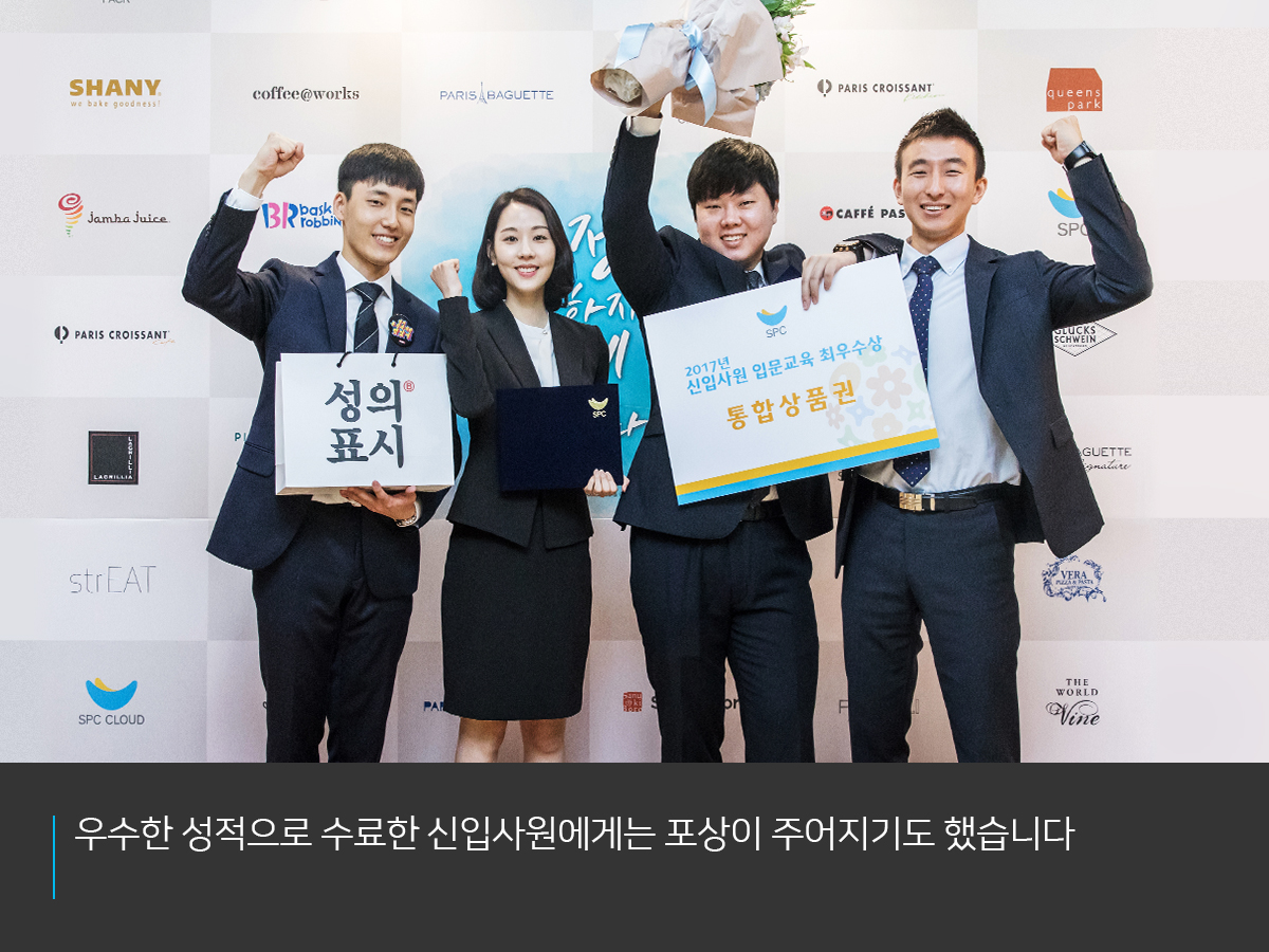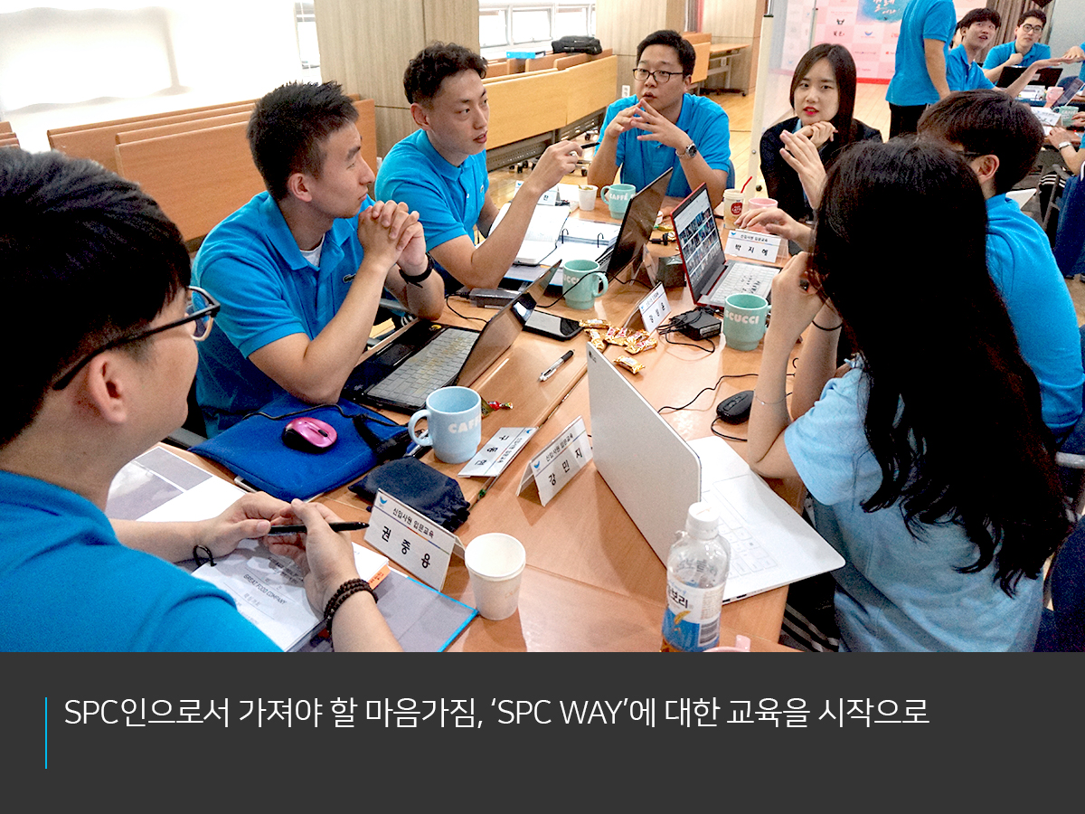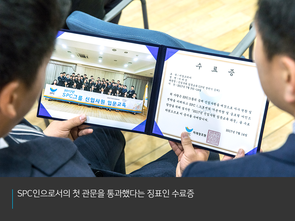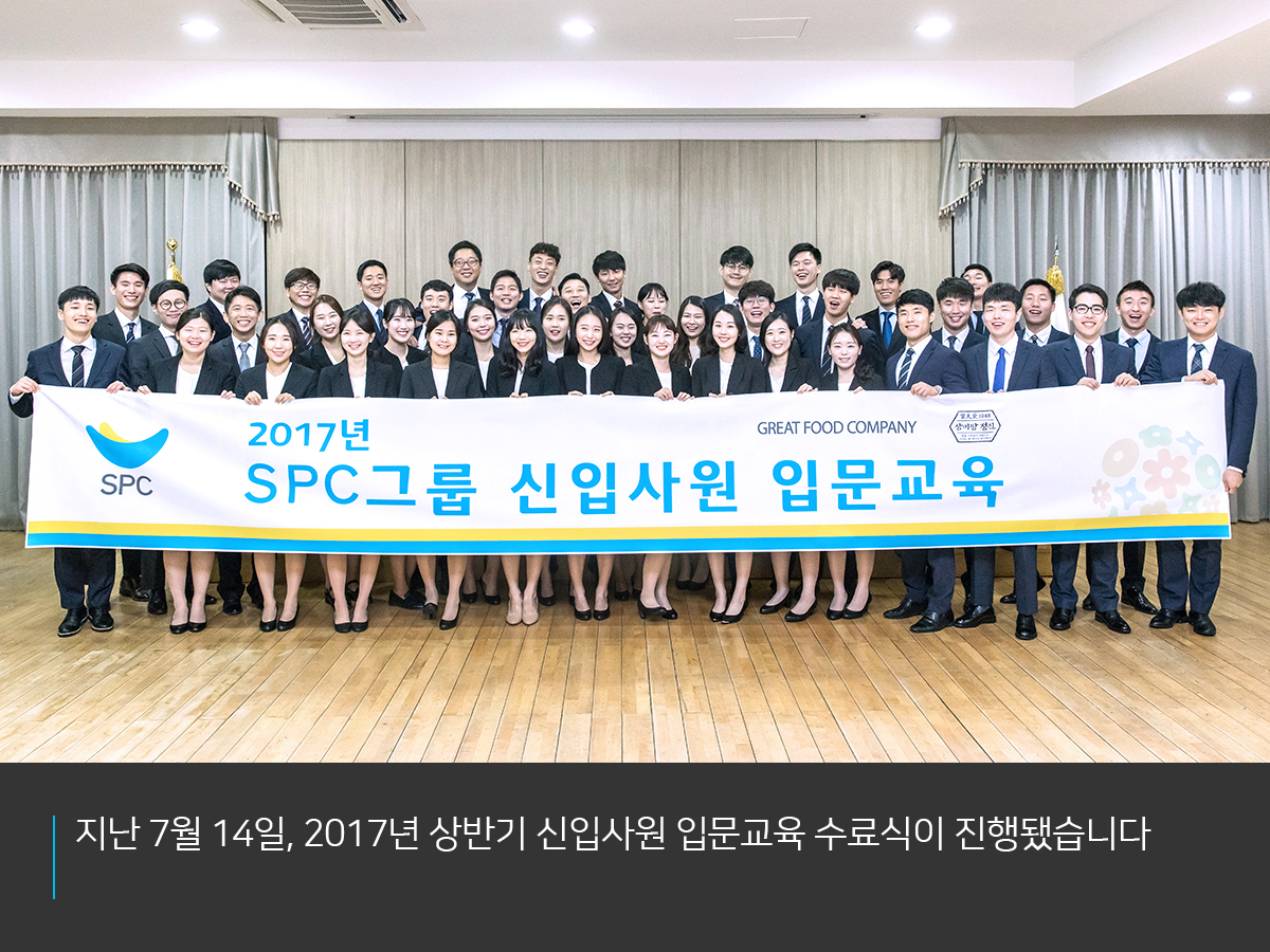 2017년 상반기 공채 신입사원 총 43명에 대한 입문교육이 지난 7월 3일부터 11박 12일간 진행됐습니다. 이번 ‘2017년 상반기 신입사원 입문교육’은 그룹 경영이념과 사업 현황을 공유하는 한편 SPC인재상 및 윤리경영 등 사내제도와 시스템 이해, 일 처리 방법과 비즈니스 매너 등 기초 업무 역량을 배양하기 위해 마련됐습니다. 교육 참가자들은 ‘SPC WAY’ 교육을 시작으로 제빵, 커피, 아이스크림 등 주요 제품에 대한 시장 동향 및 국내외 사업 전략을 바탕으로 서울지역 일대를 직접 돌며 시장조사 활동을 벌였습니다. 또한, 경기도 SPL 평택공장 등 생산현장을 견학했습니다.