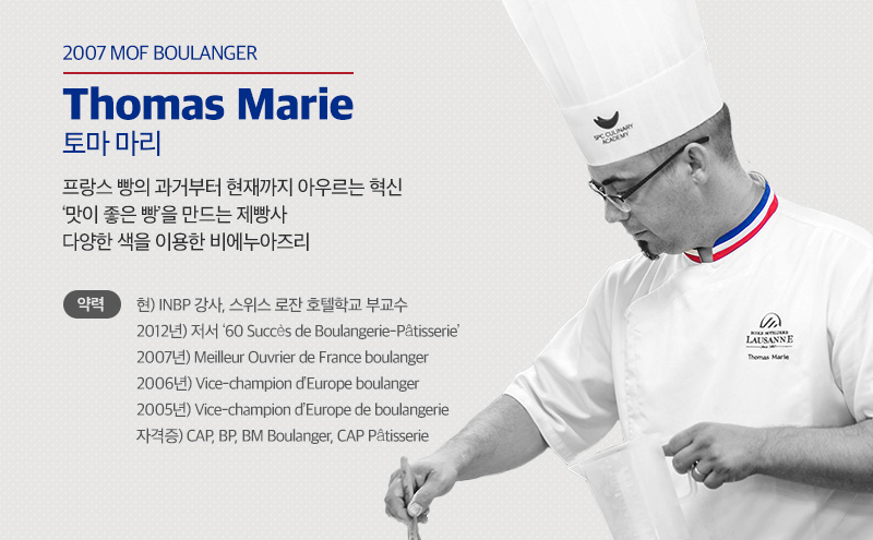 토마 마리(Thomas Marie, 이하 T). 안녕하세요 2007 MOF BOULANGERIE인 토마 마리라고 합니다. 프랑스 제빵학교인 INBP 강사이자, 스위스 로잔 호텔학교에서 부교수직을 맡아 제빵을 가르치고 있습니다.