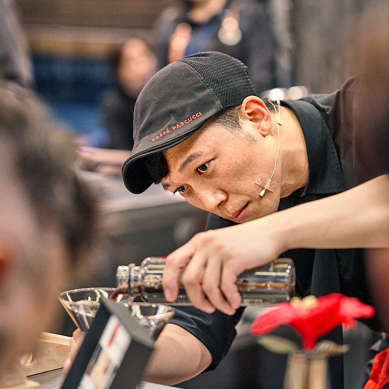 결승전에 참가한 선수들은 무대에 올라 15분의 준비시간을 가진 뒤에 약 20분간 시연을 펼치게 됩니다. 시연이 시작되면 에스프레소, 카푸치노, 창작메뉴, 총 3가지 제품을 선보이면서 해당 제품의 레시피, 향미 노트, 제품에 담긴 철학 등을 설명해야 합니다. 6명의 선수들은 각자 화려하면서도 숙련된 솜씨로 시연을 이어나갔습니다. 특히, 직접 개발한 창작메뉴를 통해 각자의 개성과 커피에 대한 해석도 표현했습니다.