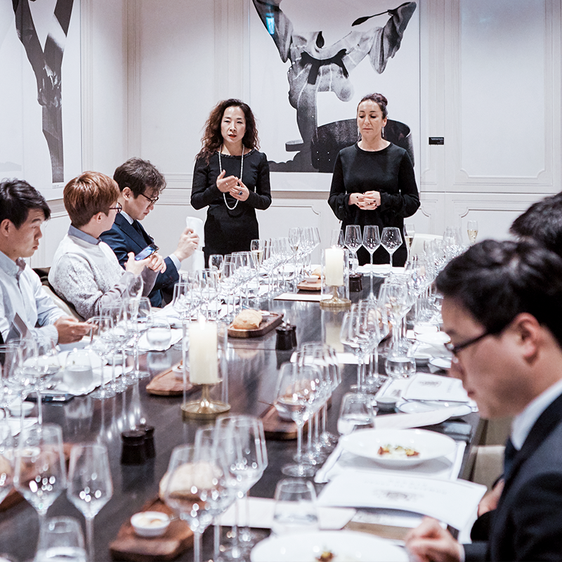 마지막으로 드디어 이 날의 주인공이라 할 수 있는 뀌베 다 카포(Cuvée Da Capo, 2015)를 맛볼 차례가 되자 참석한 모두가 기대감에 들떴습니다. 뀌베 다 카포는 보랏빛이 감도는 검붉은 컬러와 함께 효모, 소시지, 블랙 커런트 또는 블랙 체리의 과실 풍미를 복합적으로 느낄 수 있는 와인입니다. 목에서 넘긴 후에도 그 맛이 선명하게 오래가는 이 와인은 최고 20년에서 50년까지 숙성이 가능하다고 합니다. 이 날 와인을 마신 소믈리에들 역시 모두들 감탄을 금치 못했습니다.