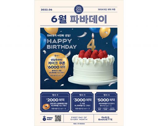 (주)파리크라상, 보도자료2022. 05. 31‘4살 맞은 파바데이’…파리바게뜨에서 풍성한 4가지 혜택 만나보세요! SPC 파리바게뜨, ‘파바데이’ 론칭 4주년 기념 4가지 풍성한 혜택 제공 see more..