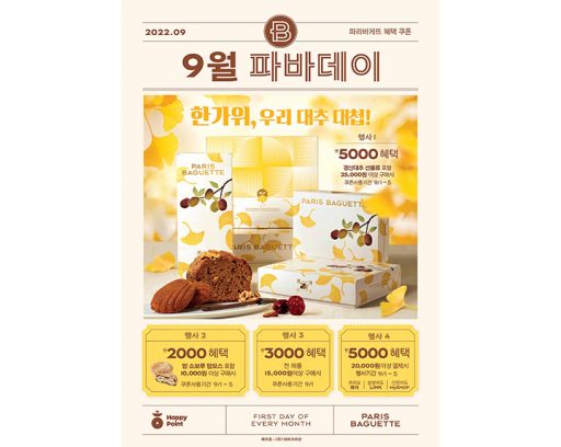 (주)파리크라상, 보도자료2022. 08. 299월 1일 단 하루, 1만 5천 원 이상 구매 시 3천 원 혜택 SPC그룹 파리바게뜨, 추석 맞이 9월의 ‘파바데이’ 프로모션 진행 see more..
