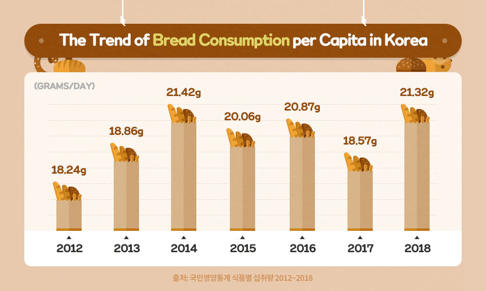 In modern Korea, bakeries are found everywhere, and bread has become so familiar to the Korean palate that it is rare to find someone who hasn’t tried it. The market size is also growing steadily. So how much bread do Korean people eat? According to the national nutritional food statistics, bread consumption per capita increased from 78 rolls per year in 2012 to 90 rolls in 2018, using an 85g red bean roll as a unit. During the same period, white rice intake has decreased, which demonstrates that many people started to prefer bread over rice (Source: 2018 Status of Processed Food Market Segment: Bread Industry, Korea Agro-Fisheries & Food Trade Corporation). In other words, there is an increasing number of people who eat bread as a staple instead of rice.