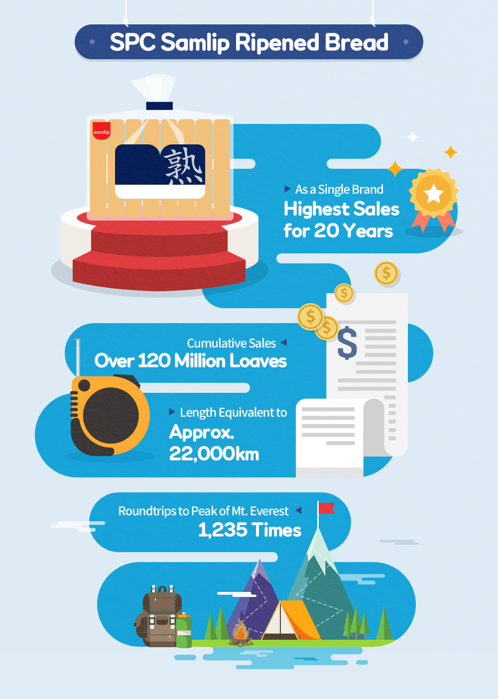 SPC Samlip’s “56-Hour Low-Temperature Ripened Bread” is a longtime bestseller celebrating its 20th anniversary this year. It has been ripened at a low temperature for a long time, and with the “tangzhong technique” that cooks the dough with hot water before baking, the bread has a moist and chewy texture. The Ripened Bread has the largest sales volume as a single brand, with cumulative sales of more than 120 million loaves over its 20-year history. If you convert the sales record of this bread into length, it equals 22,000 km, which is equivalent to 1,235 round-trips to Mt. Everest at the elevation of 8,848m. Officially certified by KRI (Korea Record Institute), SPC Samlip will continue to record the history of our Ripened Bread, which has long provided happy experiences to our customers with our expertise in baking.