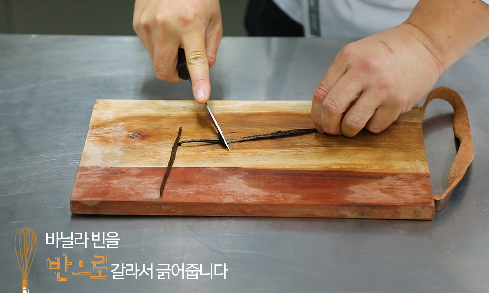 1. 바닐라 빈 2개를 반으로 갈라서 긁어줍니다.