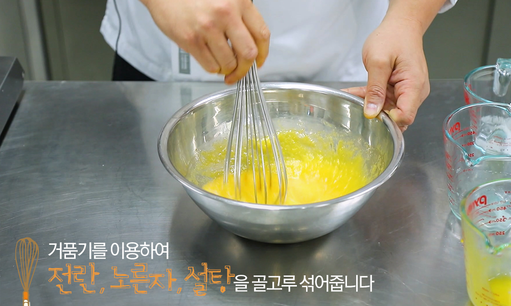 3. 거품기를 이용하여 전란 375g, 노른자 220g, 설탕 525g을 골고루 섞어줍니다.